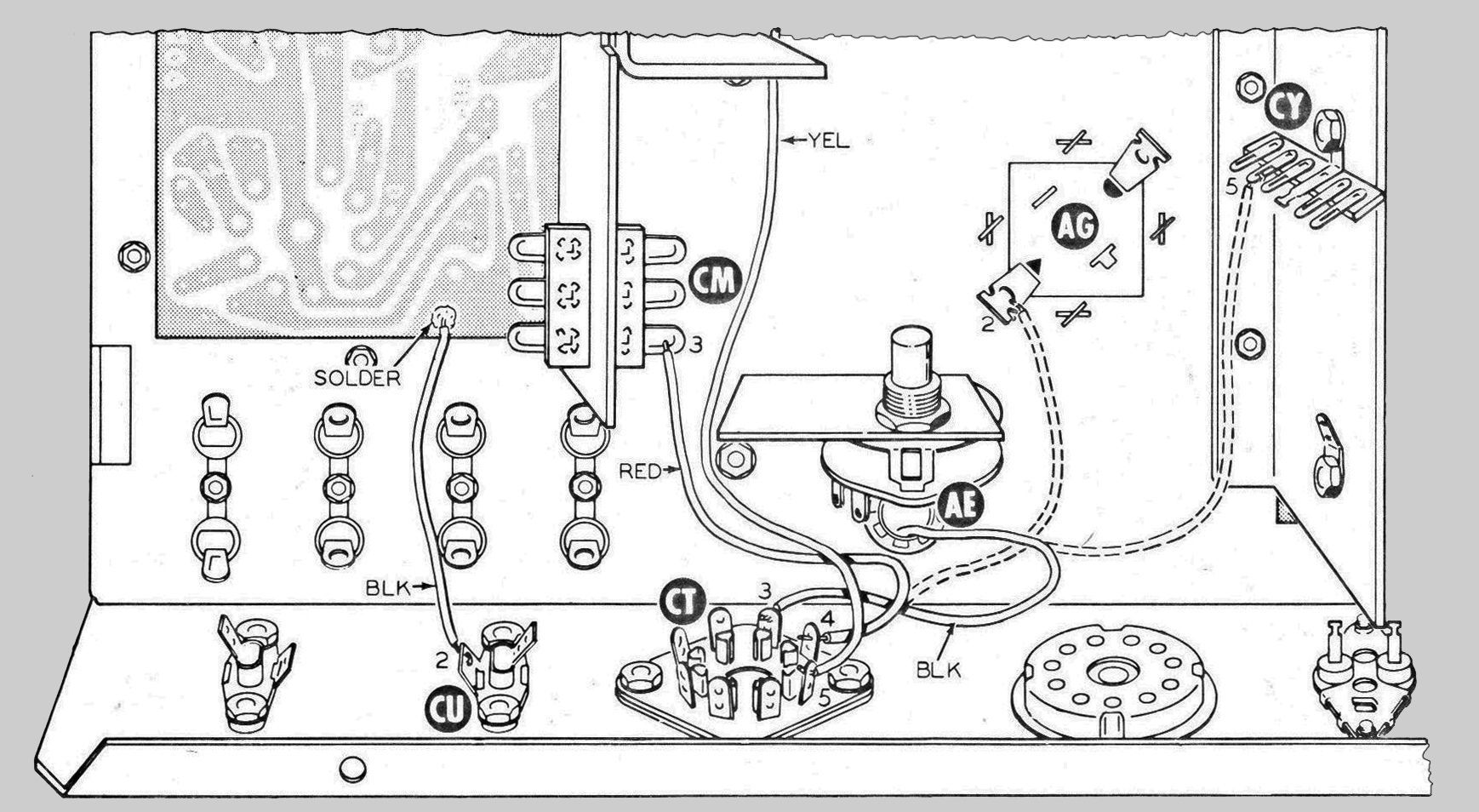 A modification of the HW-17 is required to user the HWA-17-2 FM adapter. This modification was already installed on the HW-17A. To determine if the modification is present, remove the bottom cover of the HW-17 and refer to illustration. Look for a black wire connected between lug 2 of jack CU and the circuit board as shown. Check also for a red wire connected from lug 3 of terminal strip CM to lug 4 of socket CT, and that a red wire is NOT connected to lug 2 of capacitor AG. These changes suggest the modification has been accomplished.