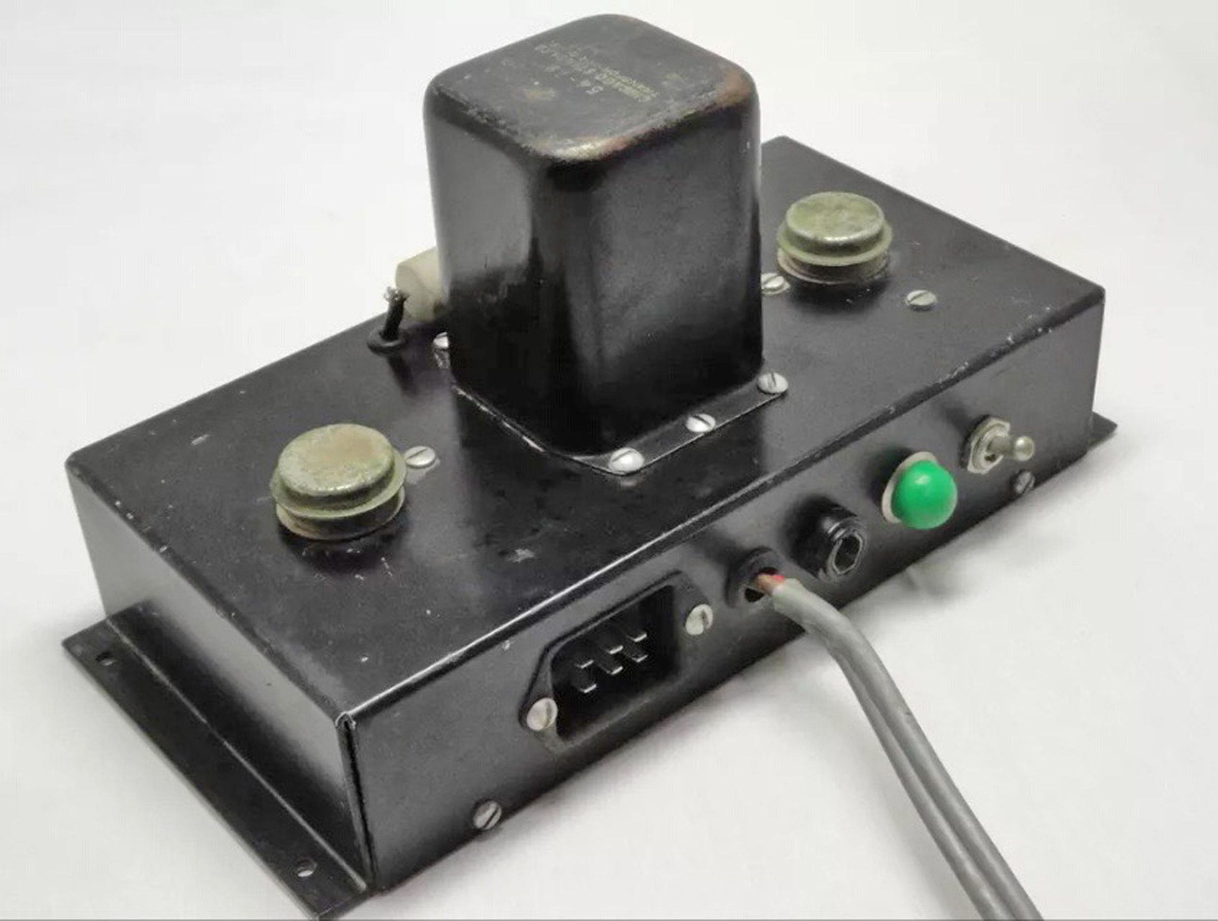 The front panel contains a Jones plug for power output, a 12 volt power input cable, an on/off toggle switch, a pilot lamp and a fuse.