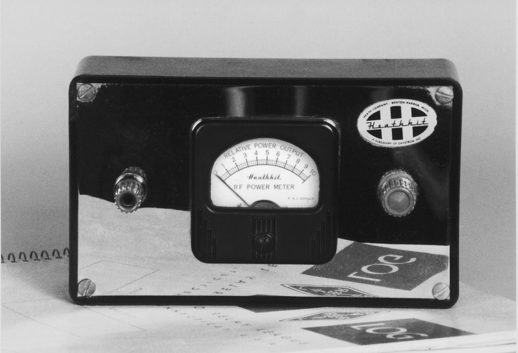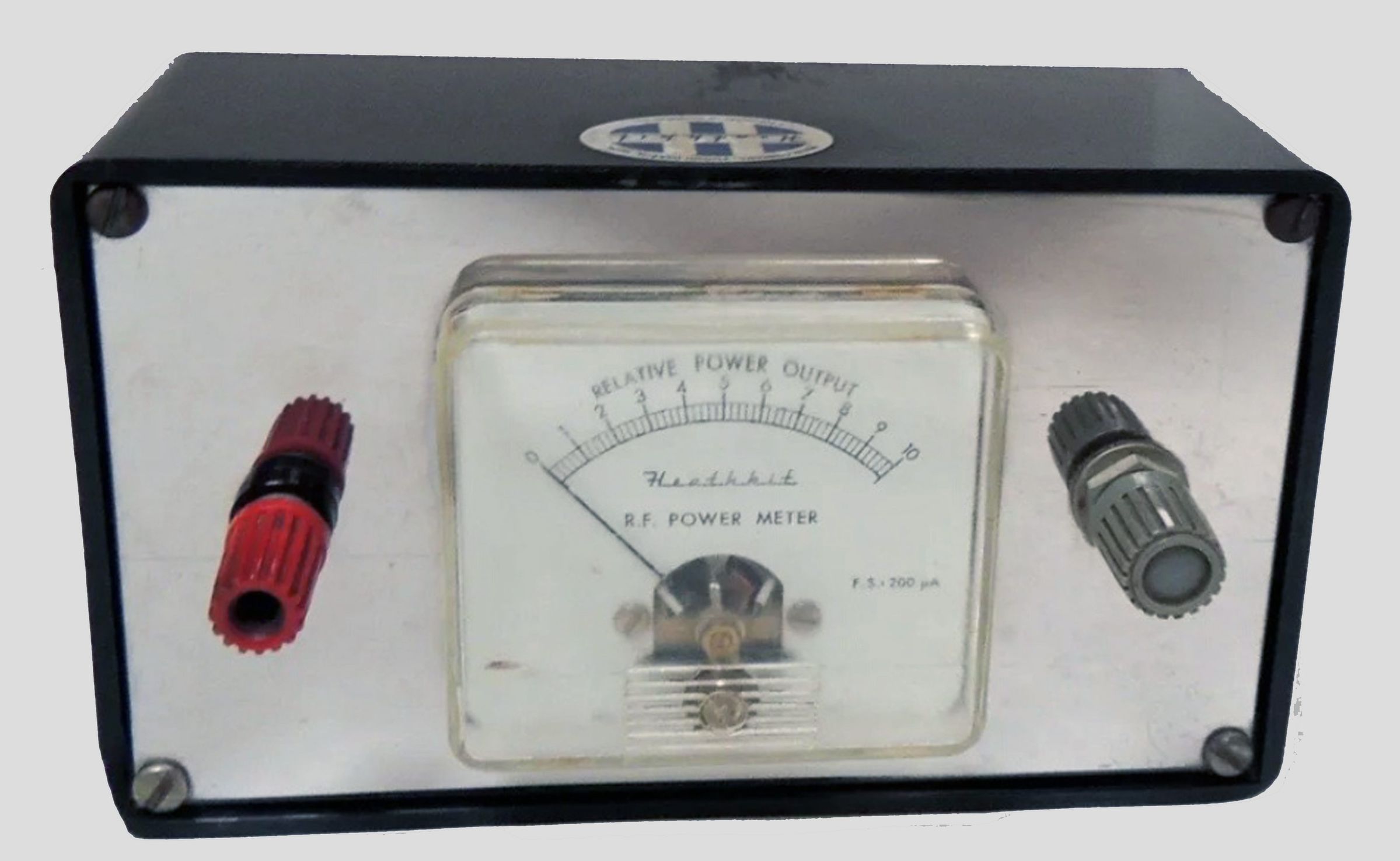 Here then is a small black Bakelite box with a mirror-like chrome front panel. Heath had used small Bakelite boxes before—but not in its amateur product line. It is not clear why Heath chose this design, but it was used for just under two years before being replacing by the PM-2, which conformed to the basic amateur products design philosophy. It is also the only Heath product to use the oval nameplate sticker seen (usually) on the front panel. The Bakelite panel meter (200 µA full scale) was provided by Simpson and reads relative power on a 0-10 scale with the Heathkit name. Not common. A version with a plastic meter, from production toward the end of the run, qualifies as rare.