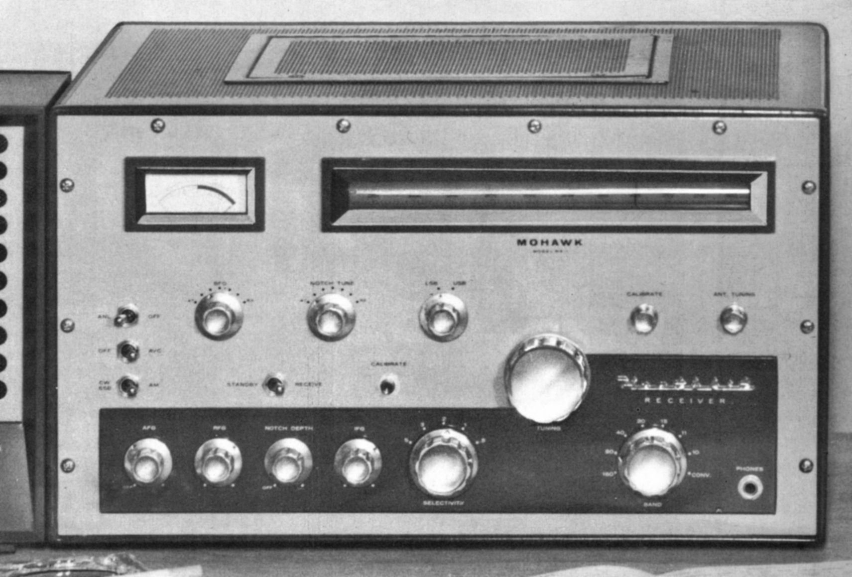 The front panel provides controls for RF, IF and AF gain (with power switch), notch tuning, notch depth, ANL, AVC, BFO, and the band switch. Additionally there are controls for main tuning, calibrator set, calibrator on/off, antenna trimmer, receive/standby, mode, and selectivity. There is also a standard quarter-inch headphone jack on the front panel.