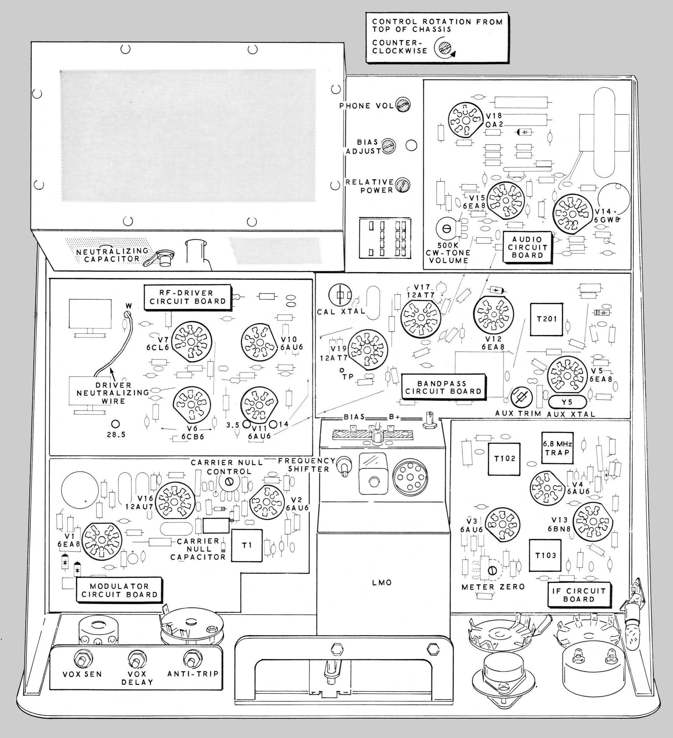 A minor change to the SB-101 was deletion of the 600Ω audio output jack. This jack was changed to a spare, for a total of two spare jacks. These jacks can be used for connection of the SB-610 or SB-620. After the release of the SB-102, owners of the SB-101 were offered an upgrade kit (for a small charge). This up-grade kit addressed only one of the improvements found in the SB-102—receiver sensitivity. The kit amounted to a new RF amplifier tube (a 6HS6 to replace a 6AU6 at V10) and a couple of new parts. Checking for the presence of this mod is a bit tricky. All of the changes made are made to the component side of the RF driver circuit board. This board sits directly in front of the final amplifier cage. Look between tubes V10 and V11 (these are the tubes on the right-hand side of the board) for the addition of a resistor and a small disk capacitor that have been tack soldered between other existing parts. Also look for the space left by a disk capacitor clipped out near V10. These changes indicate that the mod has been done. Note that 6HS6 tubes are scare today and may have been replaced by a 6AU6. Also, note that much of the improvement achieved with this modification can be accomplished simply by changing to the new tube.