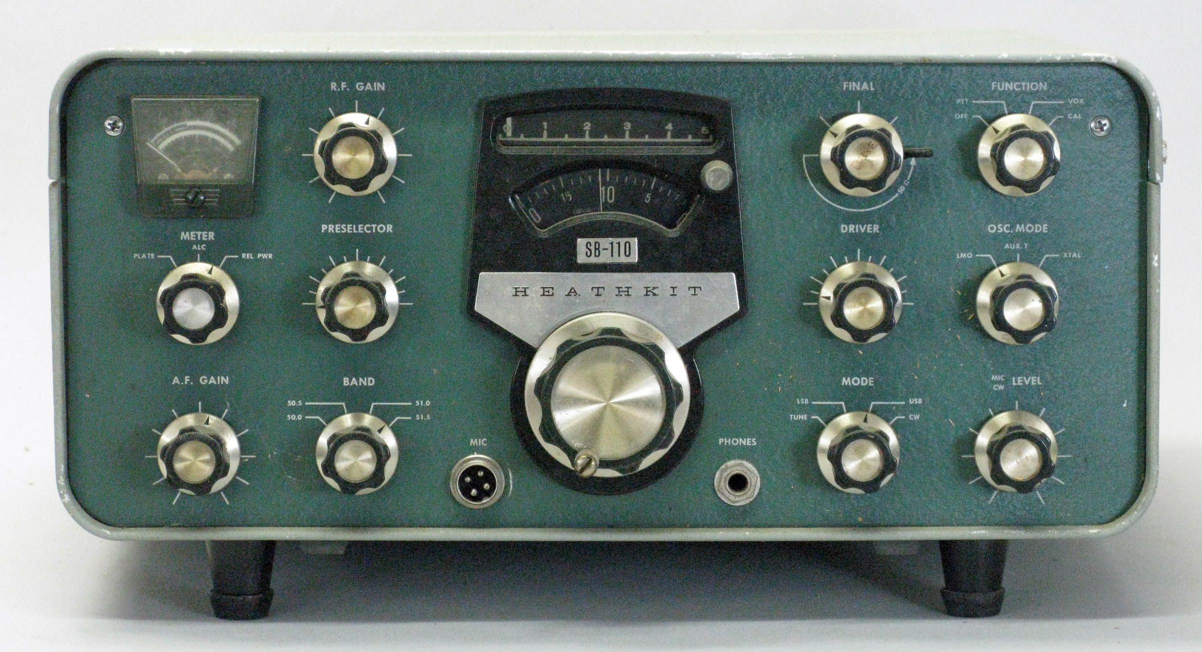 Features include switch selection of USB, LSB, and CW, as well as PTT and VOX operation. In addition the SB-110(A) features ANL, AGC, a built-in sidetone, and a built-in 100 kHz crystal calibrator. Note that calibration of the calibrator is critical since a 5 Hz error at 100 kHz will translate to a 2.5 kHz error at 50 MHz.