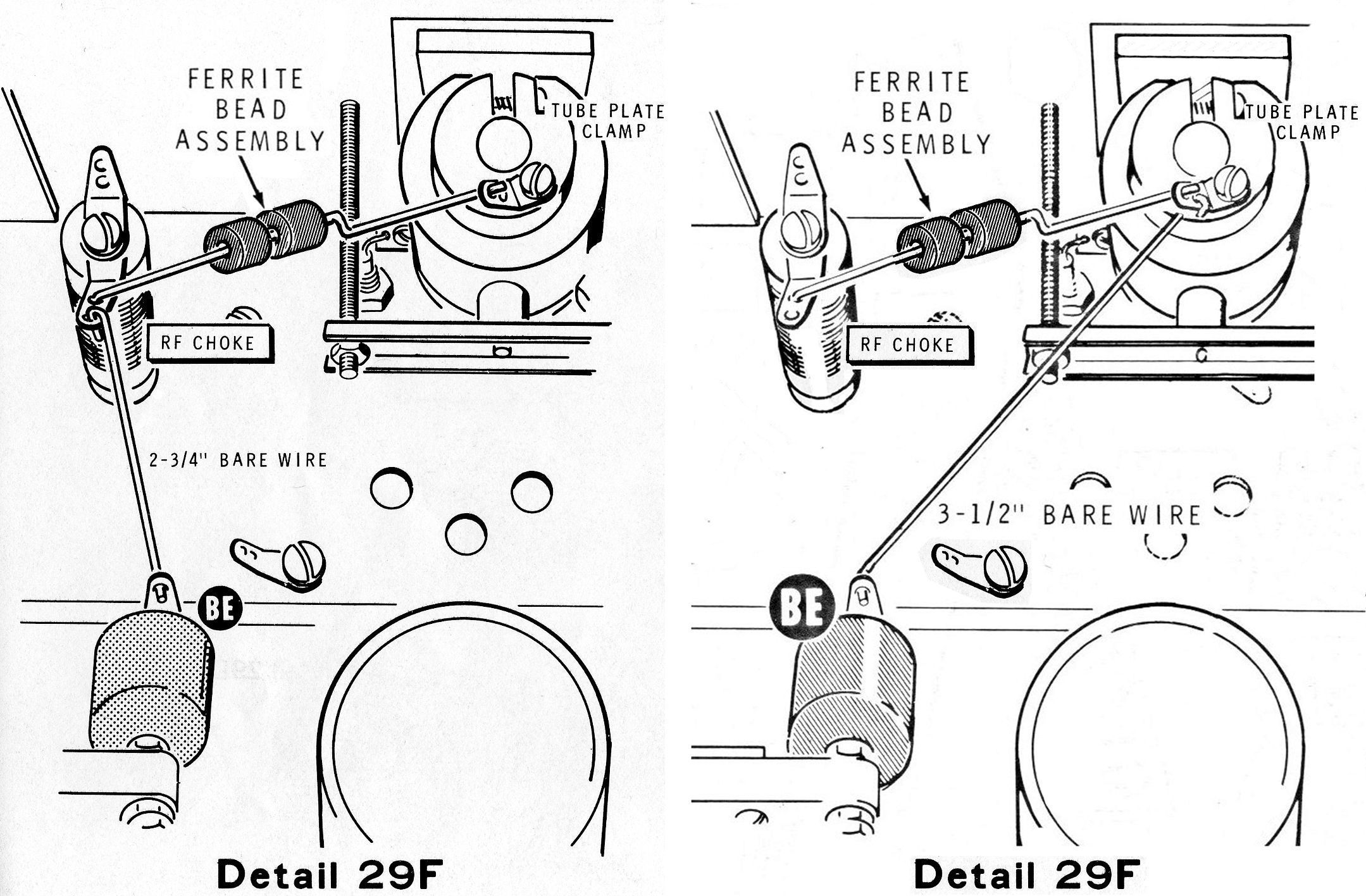 To fix the instability issue, the bulletin recommended that a wire from the choke to the output capacitor be removed and rerouted from the output capacitor (at point BE), directly to the plate cap of the 8873. This created a separate path for the RF output. This change was implemented in all future production runs. Heath recommended the change for all prior SB-230s.