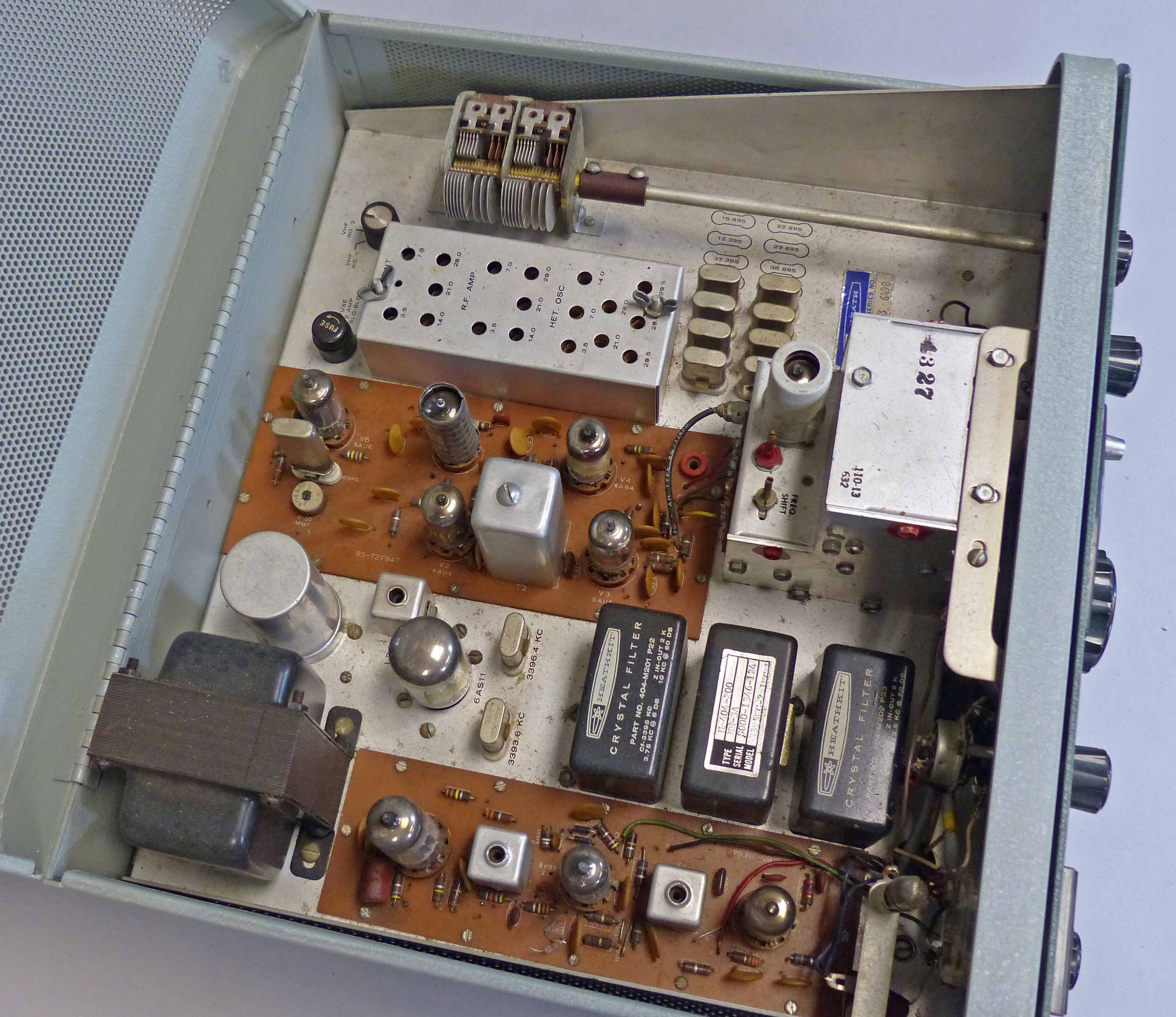 The receiver's sensitivity is rated at better than 1 µV for 15 db signal plus noise-to-noise ratio. Selectivity is 2.1 kHz at 6 db down for SSB operation. The SSB crystal filter was supplied as standard equipment with the SB-300, but Heath also offered an optional 3.5 kHz AM filter, and an optional 400 Hz CW filter. The presence of these filters may be determined easily by opening the top cover. The filters are small, (usually) black, rectangular modules about 2.5 inches wide mounted in a row between the LMO and the S-meter and are (from front to back) CW, SSB, and AM. A total of three filters may be installed. Without the proper filters installed, the SB-300 will not operate with the mode switch in the AM or CW position, however, reception of these signals is still possible in the SSB mode.
