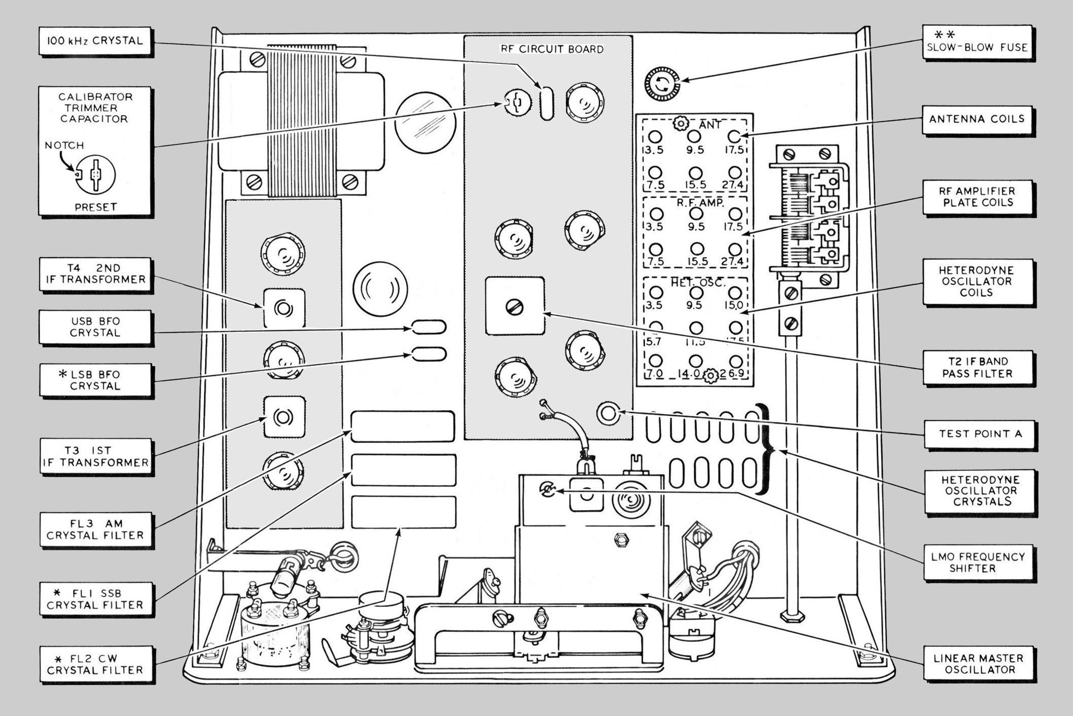 The SB-310 will tune USB, LSB, AM, and CW but came out of the box with only a 5 kHz AM filter. Note, this is the wider filter, as opposed to the narrower 3.75 kHz AM filter that was used with the SB-301, for example. Refer to SB-100 for a discussion of available crystal filters. A CW and two different SSB filters were optional. The SB-310 will not function in CW or SSB unless the appropriate filters are installed. The filters are the same ones used in the SB-301, but not the same as in the SB-300. The filters are small rectangular modules located between the LMO and the S-meter and are (from front to back) CW, SSB, and AM.