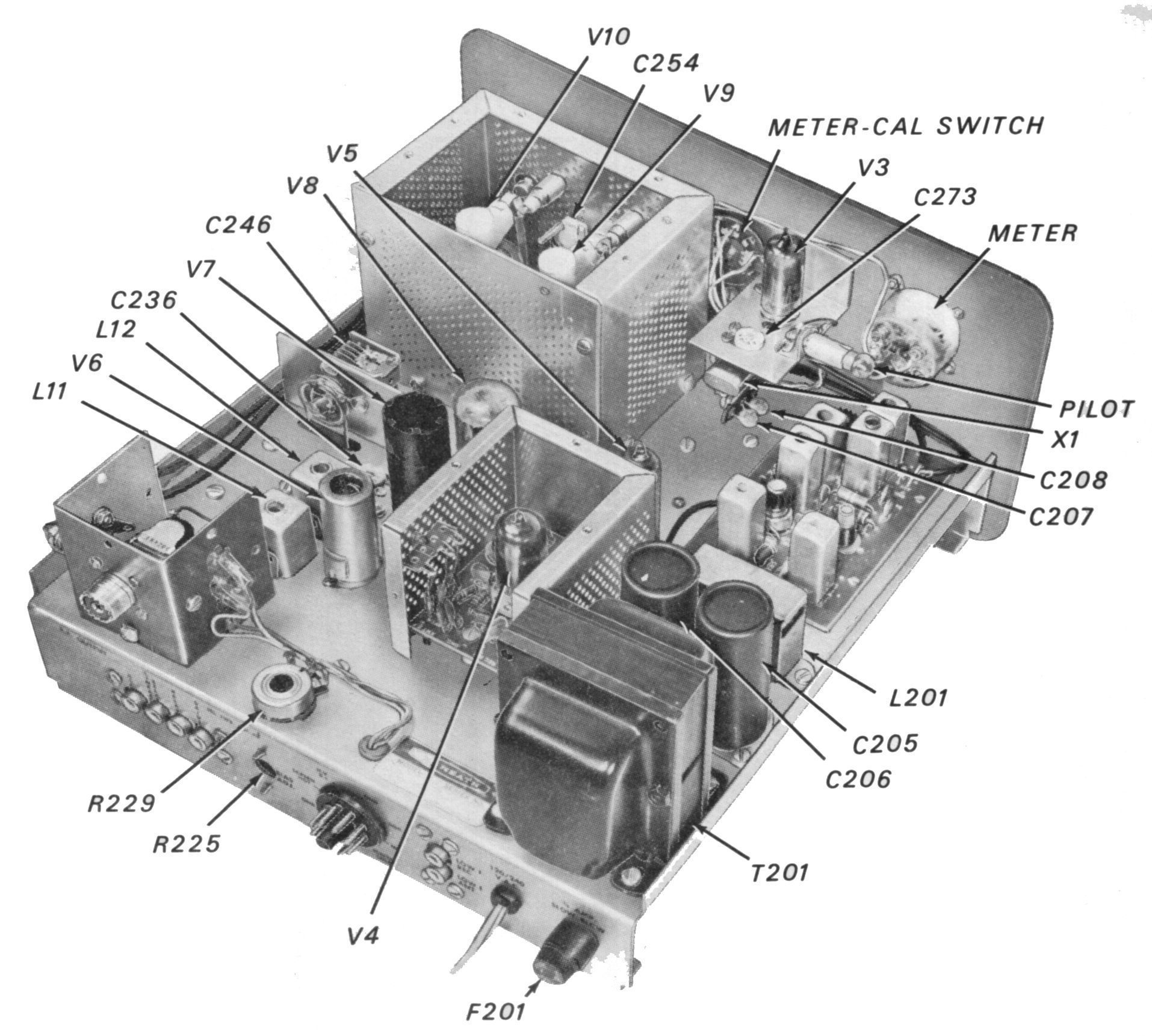 A regulated 150 volt supply powers the RF amplifier/mixer, heterodyne oscillator and crystal calibrator. The front panel meter reads plate current and relative power. The meter itself is the same one used with the SB-400/401.