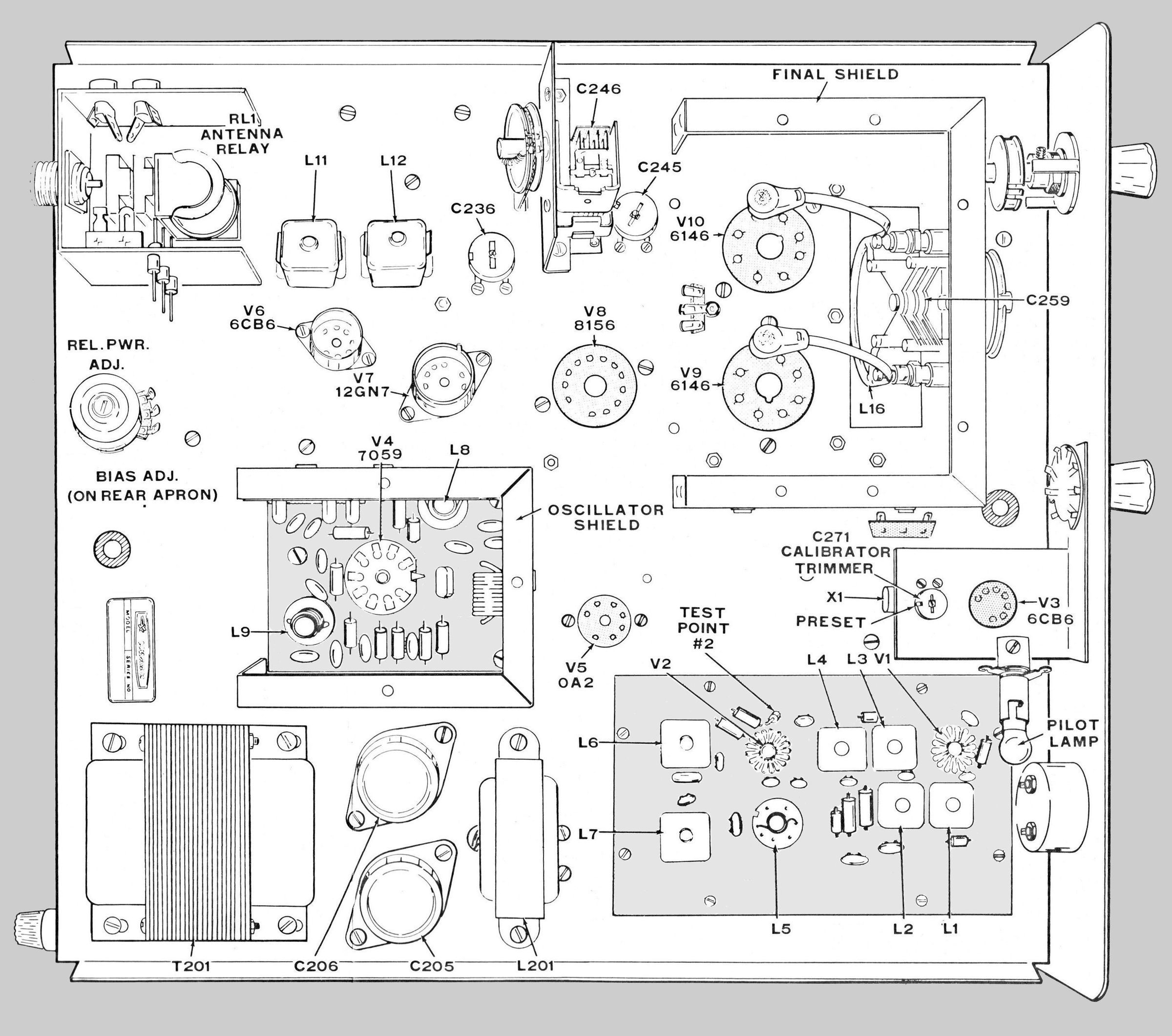 Front panel controls include meter function/calibrate switch, final tuning, on/off function, preselector, final loading, and driver tuning. Internal controls include relative power adjust and bias adjust. An illuminated front panel meter reads plate current or relative power.