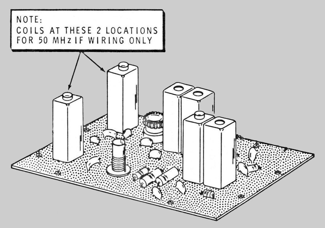 The frequency range of the SB-500 is any 2 MHz segment from 144 to 148 MHz translated to 50-54 MHz or 28-32 MHz. Determining which frequency option was chosen is simple. Refer to illustrations. Locate the receiver PC board at the left front corner of the unit. On the end of the PC board farthest from the front panel there is space for two metal can-type coils (L6 and L7). If the cans are present, the unit has been wired for operation with the SB-110 and 110A six-meter transceiver. If the cans are not in place, the unit has been wired for operation on the 10-meter band with the SB-101 or 102, the HW-100 or 101, or the SB-301/401 combination.