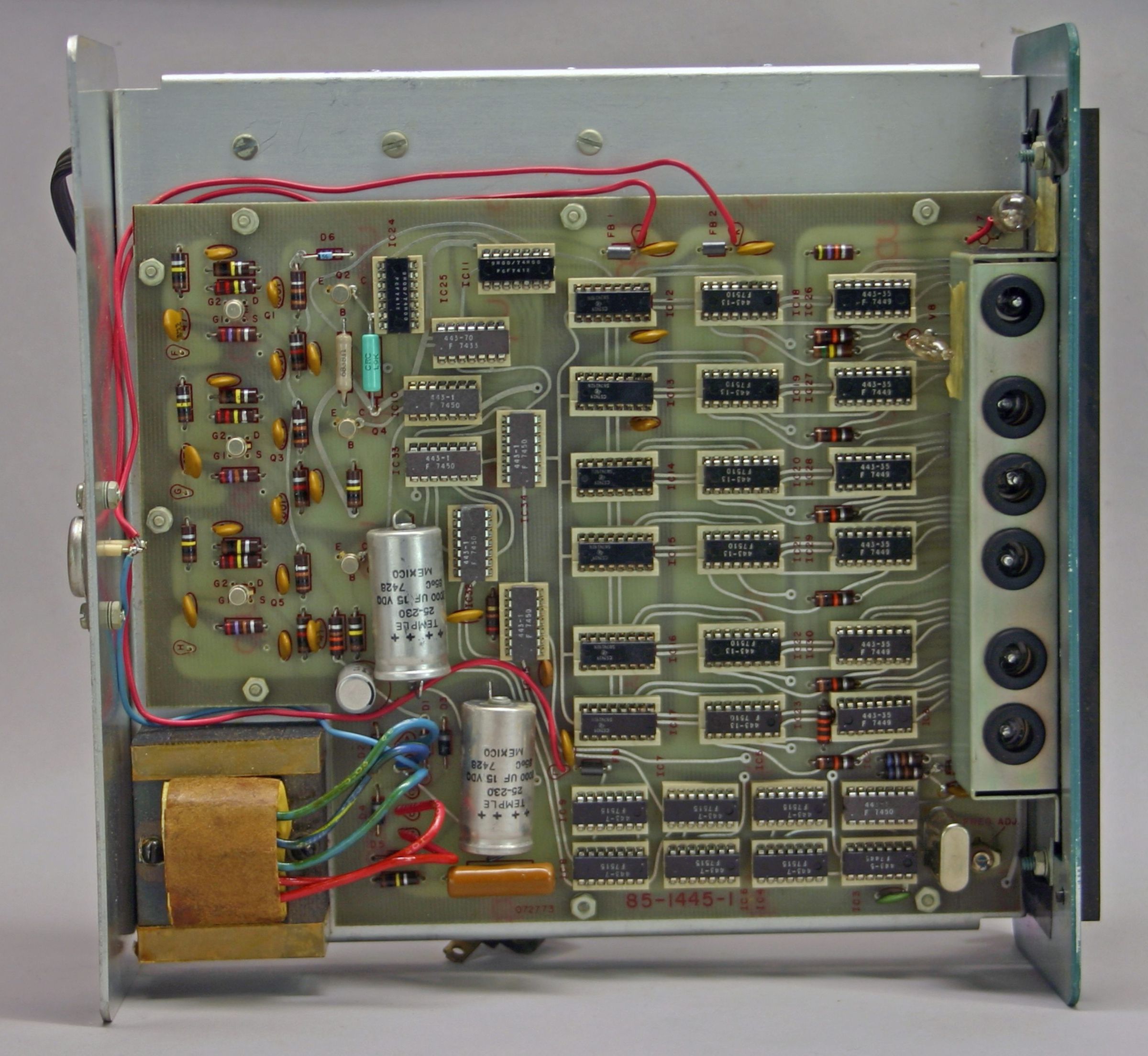 Except for the readout tubes, the SB-650 is a fully solid state device and is built on one large double-sided PC board. It uses 36 ICs, six transistors, and a handful of diodes. The display uses six Nixie tubes and provides a readout to 100 Hz.