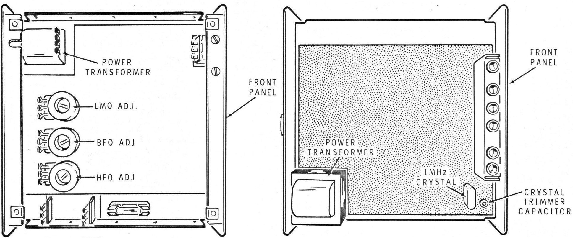 The only front panel control is an on/off rocker switch. There are four internal controls. Refer to illustration. Three of these are potentiometers used to set the levels of the BFO, LMO, and HFO signals. The fourth is a trimmer cap used to calibrate the unit. Calibration is very simple. Just tune the receiver to CHU (7.3350 MHz) or WWV (at 15.0000 MHz) and adjust the trimmer for the correct reading.