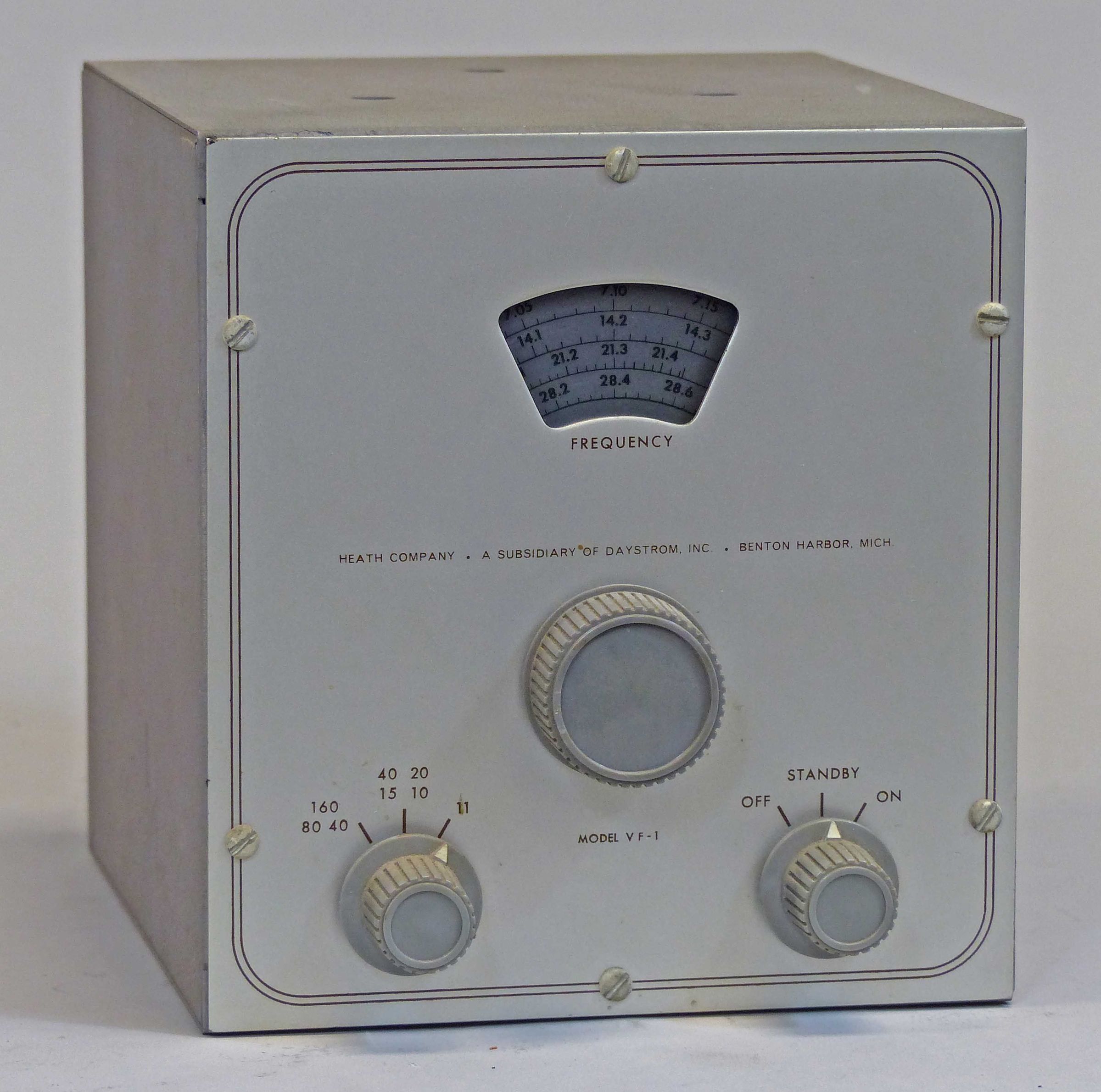 The VF-1 was Heath’s first external VFO and was released in 1954 as a companion unit for the AT-1, which had been released about a year earlier. The unit outlasted the AT-1 and later was sold for use with the DX-20, 35, and 40, although it could also be used with the DX-60 series and others. The VF-1 is the same VFO design used later in the DX-100. It covers 160-10 meters (including 11 meters) with three basic output frequency ranges and provides about 10 volts of RF drive. It uses two tubes: an 0A2 and a 6AU6. The oscillator is an electron-coupled Clapp type (a series tuned Colpitts).
