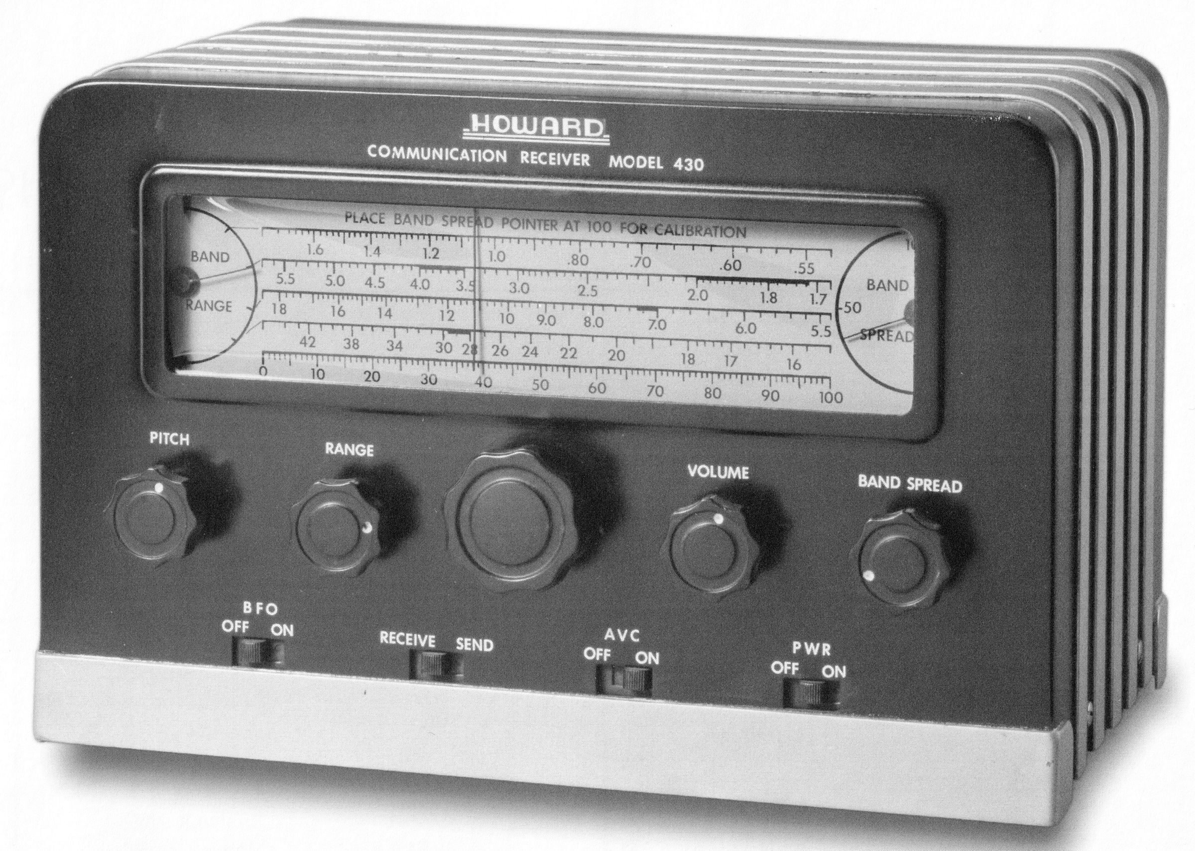 Chicago's Howard Radio Company billed itself as the "America's oldest radio manufacturer," and made radios for a number of different companies. In the 1930s and early 1940s it sold a line of communication receivers under the Howard name. The model 430 used 6 tubes and tuned from 540 kHz to 40 MHz. The half circle dial on the left is the band indicator. The half circle on the right is the band spread.