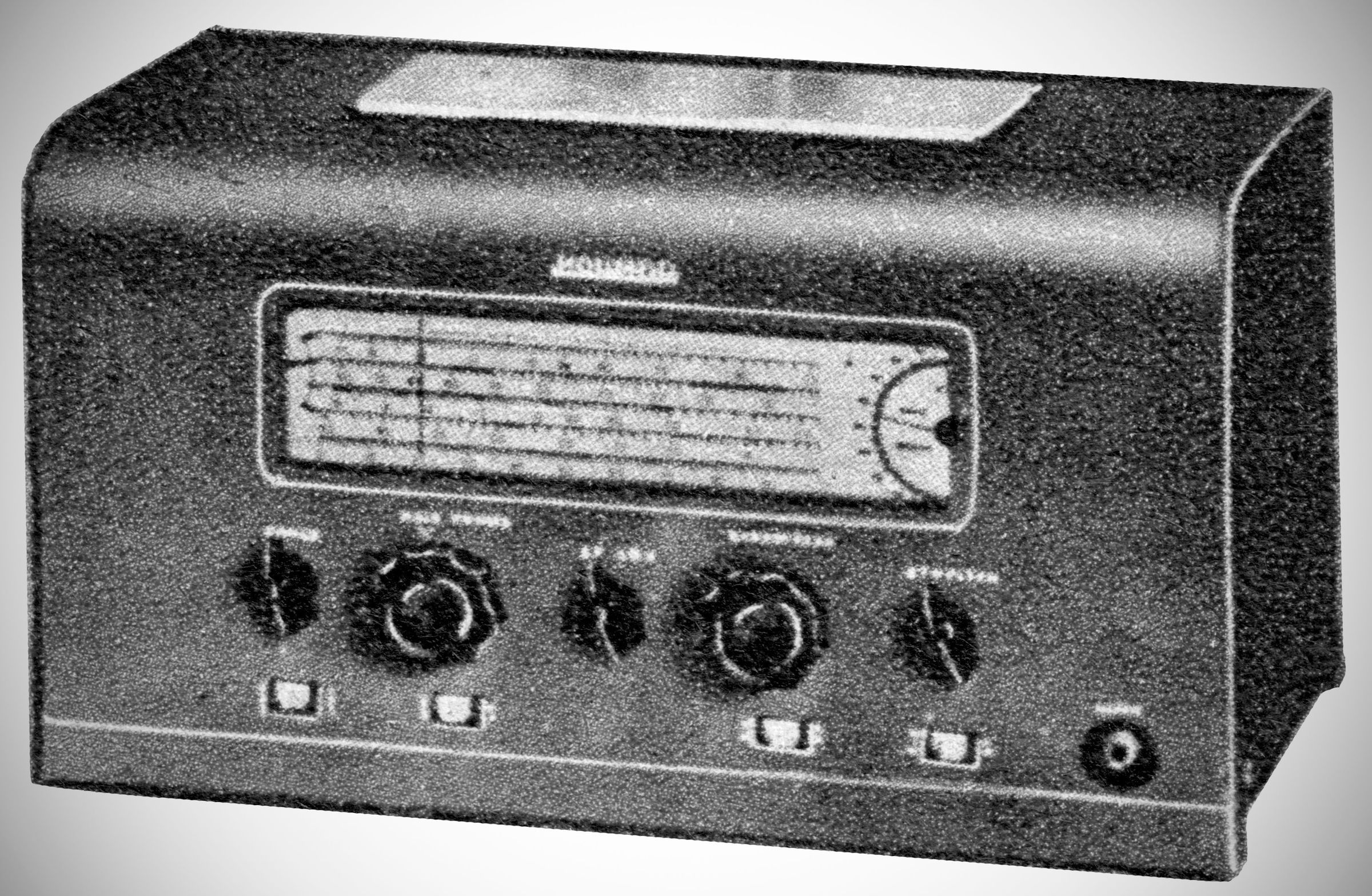 Features include: separate electrical band-spread condenser, ceramic coil forms for oscillator stability, built-in Jensen dynamic speaker, permeability type BFO, iron-core IF coils, copper plated chassis, silver plated shielding, illuminated slide-rule dial, band use indicator, electrical band-spread dial, send-receive-stand-by switch, audio gain control, BFO pitch control. AUdio output about 2.5 watts. Housed in metal table cabinet finished in wrinkle gray and trimmed with satin silver.