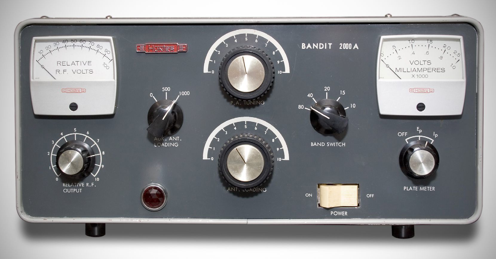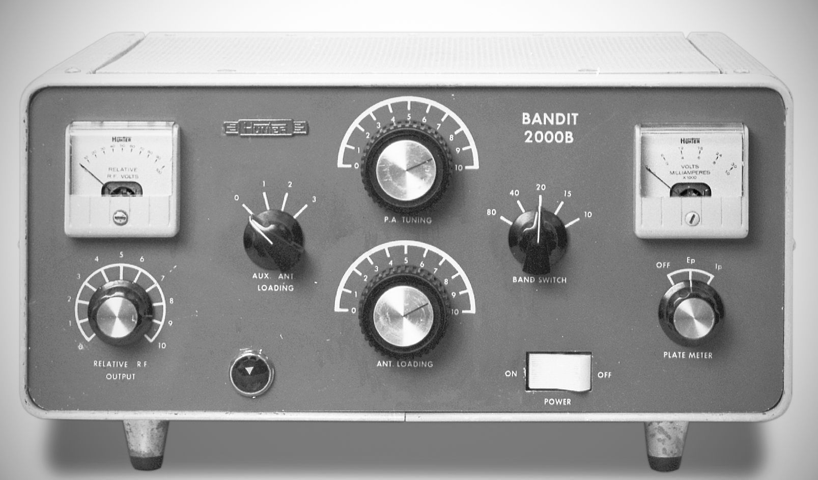 The Hunter Bandit 2000B used four United Electronics 572B tubes and was rated at 2000 watts PEP input on SSB. CW input power was 1000 watts. Hunter cautioned to reduce power considerably if the amp was used for AM or RTTY. The Bandit 2000B was available as a kit or wired & tested.