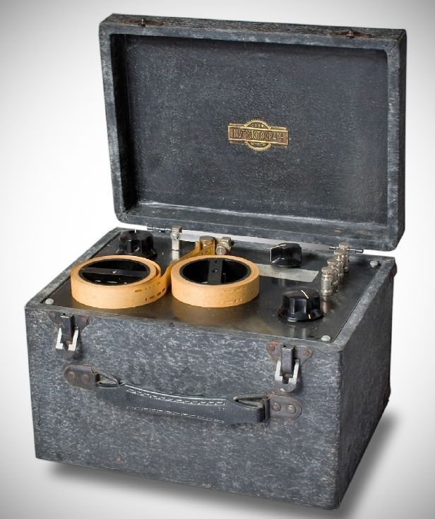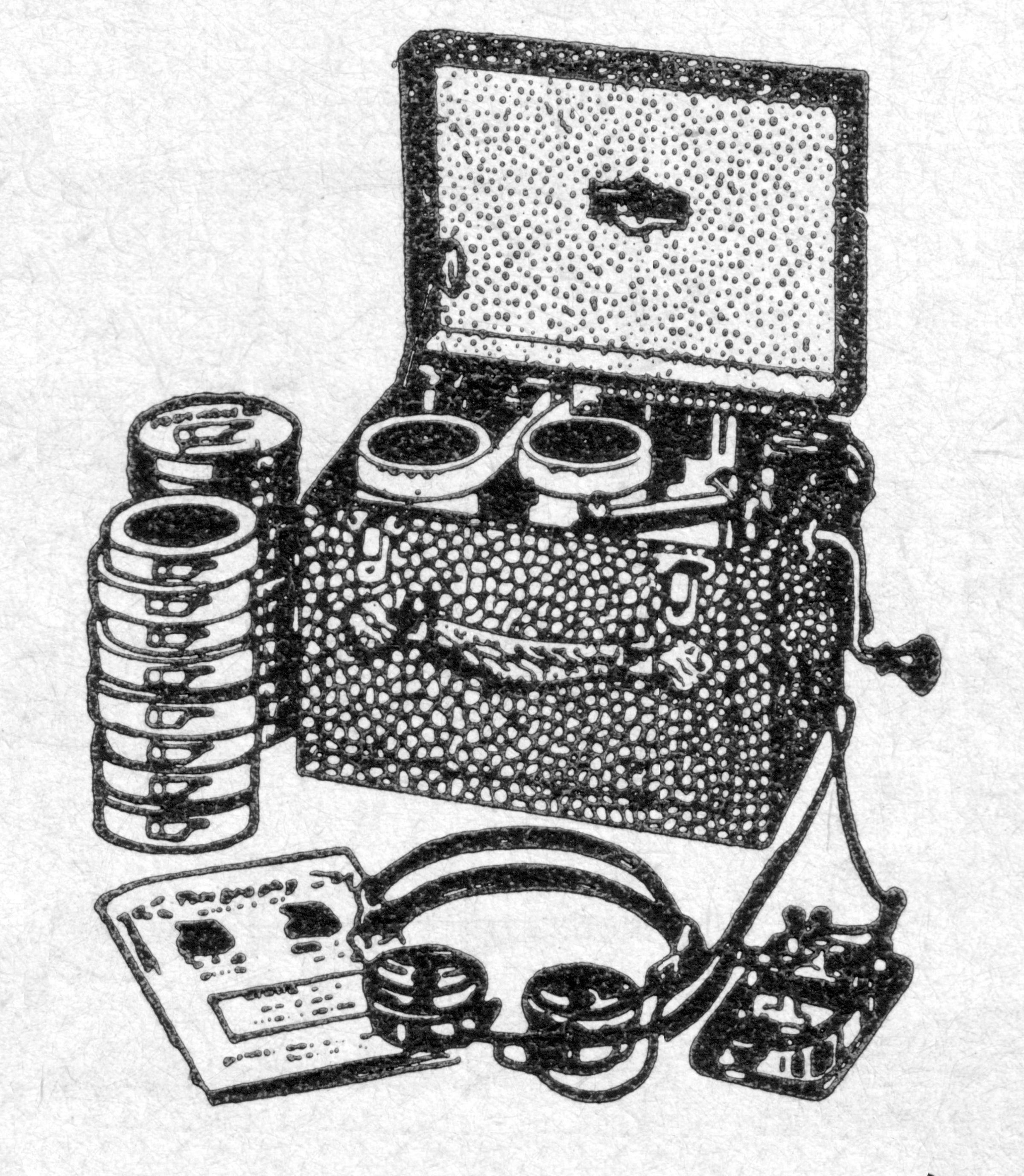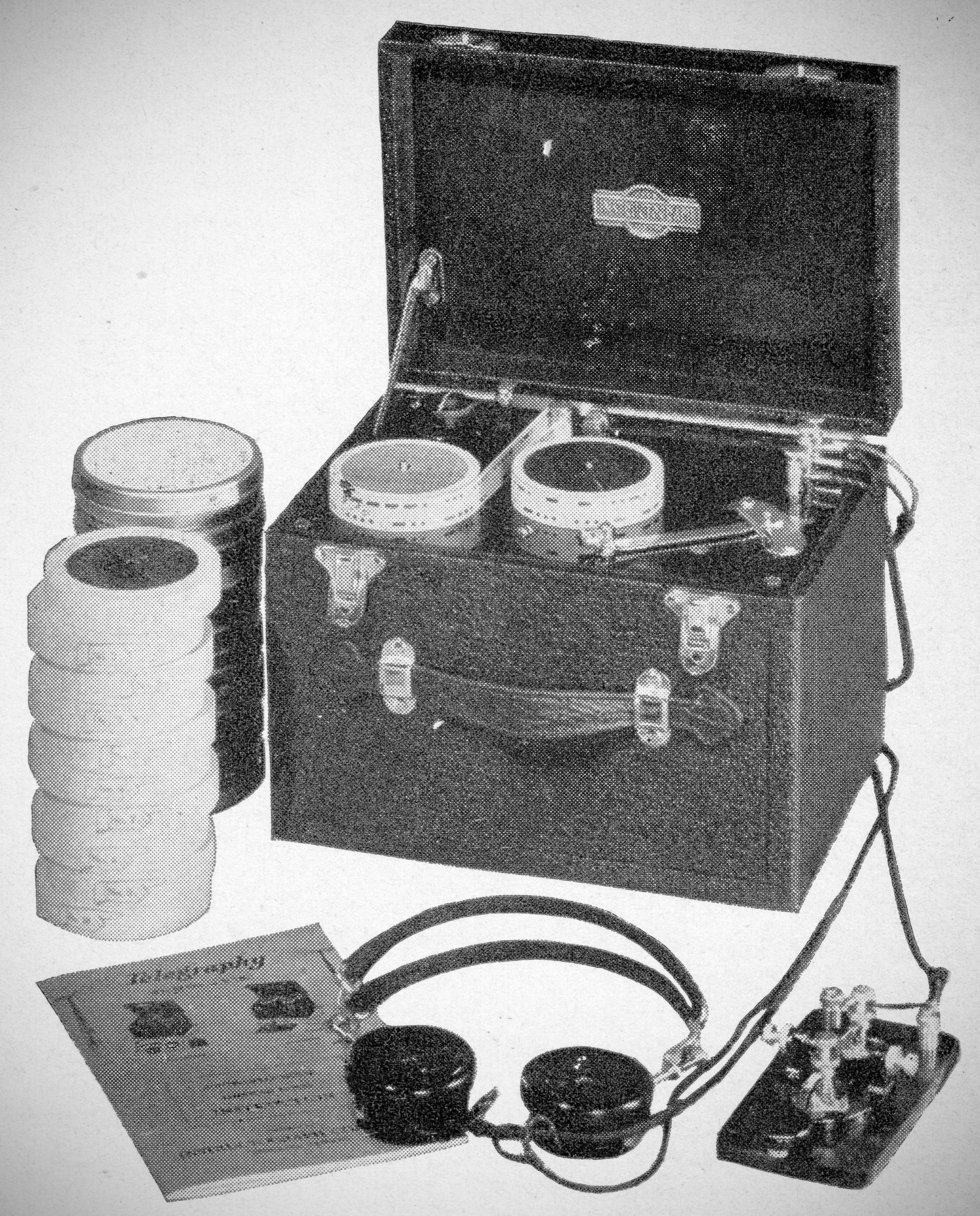Chicago’s Instructograph Co. produced code instruction equipment for more than 60 years. Their machines generated code using punched paper tapes. Early models were powered by spring-driven phonograph motors and were wound up with a crank on the side. A set of contacts keyed an external oscillator or telegraph sounder. Later versions, such as the one in the photograph, used a 110 VAC motor and had internal oscillators. Thousands of amateurs were taught and tested with Instructograph equipment over the years.