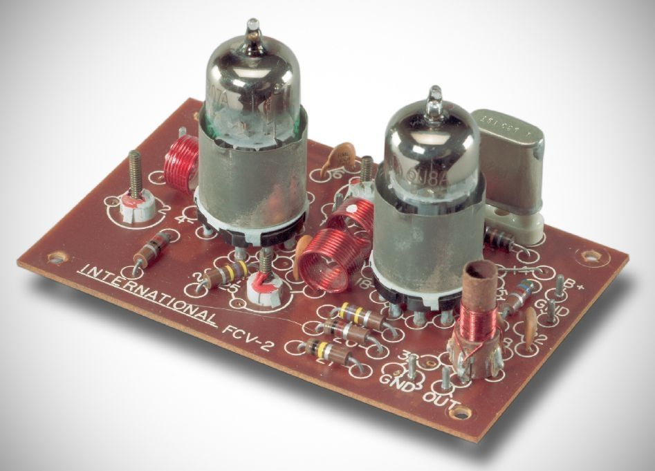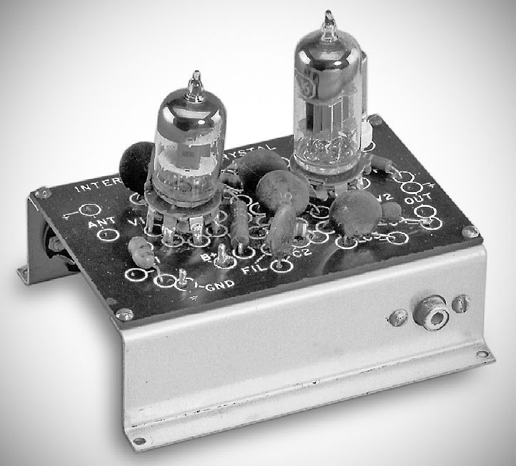 The FCV-2 six meter converter is shown here. A 2 meter model was also made. They both used a 6BQ7A RF amp and 6U8A mixer-oscillator. IF outputs from the broadcast band through 30 MHz were available. The two standard outputs were 600–4600 kHz and 7–11 MHz.