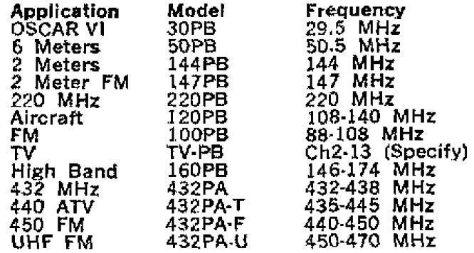 QST, Oct 1973, p. 165. QST, Jan 1974, p. 175. QST, Jul 1975, p. 158. QST, Feb 1977, p. 165. QST, Jan 1980, p. 198. Refer to Figure 1 for specific models. VHF models – $19.95 UHF models – $29.95 QST, Mar 1977, p. 167. (QSA-5)