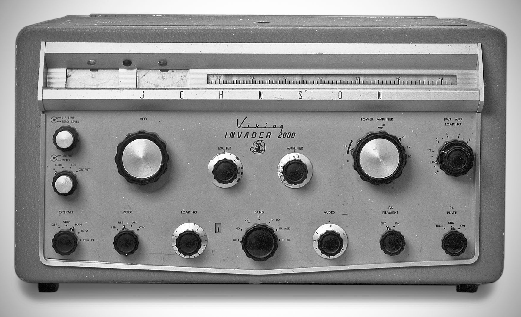The Invader 2000 was a higher-powered version of Johnson’s Invader transmitter. The Invader’s internal power supply was removed and the space filled with a Class AB2 linear amplifier using a pair of PL-175A tubes. Power input was 2 KW PEP on SSB, 1 KW on CW, and 800 watts on AM. The transmitter’s power supply was on a separate chassis. The Invader 2000 was available factory-wired for $1229.00, or a kit to convert an existing 200-watt Invader could be purchased for $619.50.