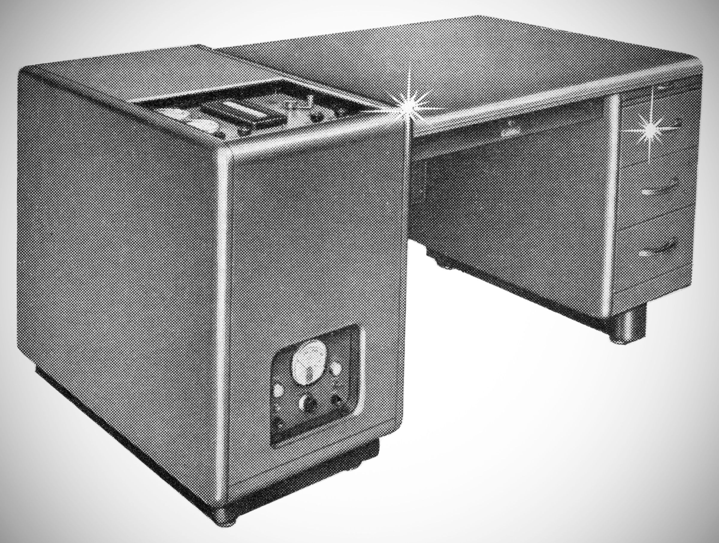 The amplifier came in a floor-standing pedestal enclosure that could be combined with an optional desktop and three-drawer pedestal. The amplifier unit pulled out of its enclosure on ball-bearing rollers for access and maintenance.