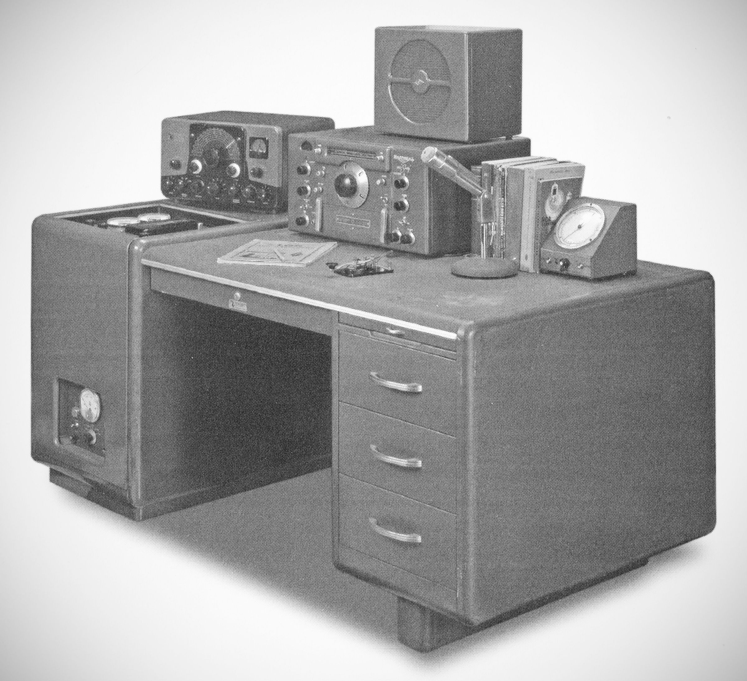 The concept of a desk-based or "package" radio station was first attempted by Kluge Electronics in 1946 with the "California Kilowatt." Johnson choose to use a somewhat less integrated (and subsequently more versatile) approach, and had modest success with the Desk Kilowatt. Hallicrafters designed an integrated station (the SR-500) in 1955, with somewhat less success.