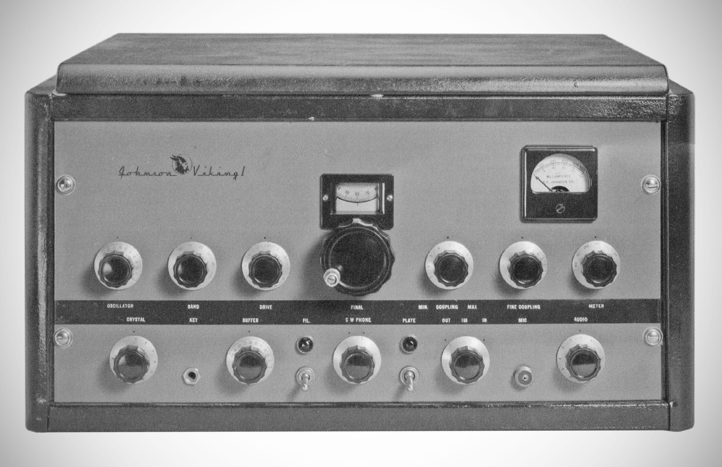 The Viking I was a self-contained, tabletop CW and AM phone transmitter covering 160-10 meters. The 4032 final was modulated by P-P 807s and had 100 watts output on phone, 115 watts on CW. It had switch selectable positions for 10 crystals as well as a provision for VFO input.
