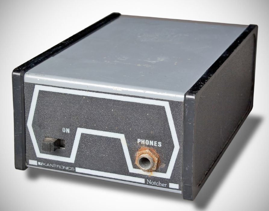 The Notcher CW audio filterhad a passband of 150 Hz. It plugged into a receiver’s audio output and had its own headphone jack. Power was furnished by an internal 9 volt battery or an external 5–15 VDC source.