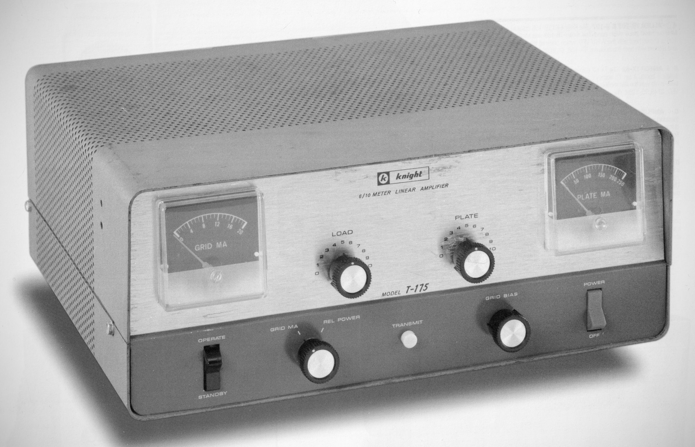 The Knight-Kit T-175 6 and 10 meter linear amplifier used a pair of 6JE6A sweep tubes. It ran 150 watts input on CW, 300 watts PEP on SSB, and could be used on AM by reducing input power to 240 watts. It had an automatic antenna changeover relay and internal cooling fan.