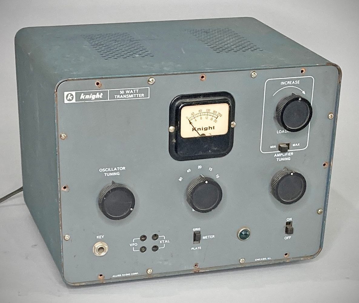 Knight's 50 watt CW transmitter came in kit form. It offered band-switching coverage of 80-10 meters, with a 6AG7 /807 tube lineup and a 5U4 rectifier in its internal power supply.