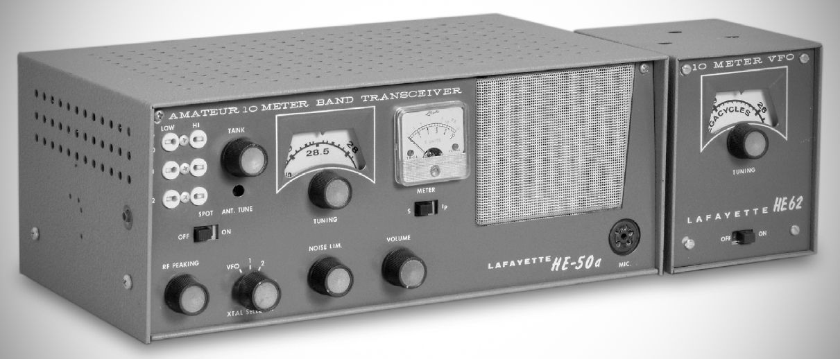 The Lafayette HE-50A 10 meter transceiver had a 12 watt, crystal-controlled AM transmitter and a tunable superhet receiver. It had built-in 117 VAC and 12 VDC power supplies. The HE-62 provided the HE-50A’s transmitter with VFO flexibility.