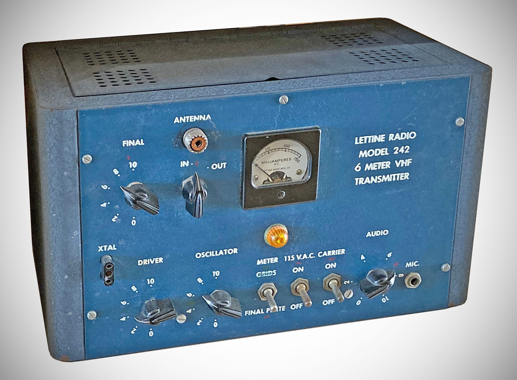 Lettine Radio Mfg. Co. of Valley Stream, New York ran ham magazine ads for their 240-or 260-series transmitters and accessories during the 1950s and '60s. Even though the content changed, the ads maintained a consistent appearance from month to month. The Model 242 was a 45 watt AM and CW transmitter for 6 and 2 meters. It used plug-in coils and had a 6146 final.