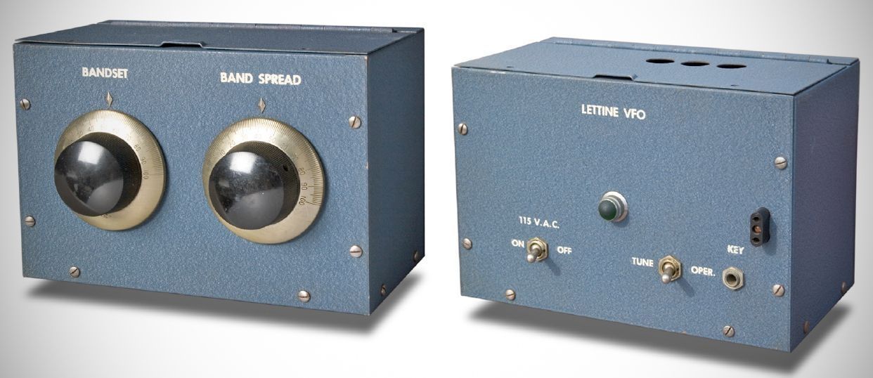 The Lettine VFO was a two-part affair. The coil and tuning capacitors were housed in one box, the oscillator tube and power supply in the other. Frequency coverage was determined by the plug-in coil. The VFO worked with Lettine’s line of transmitters, different models of which covered 160 through 2 meters.