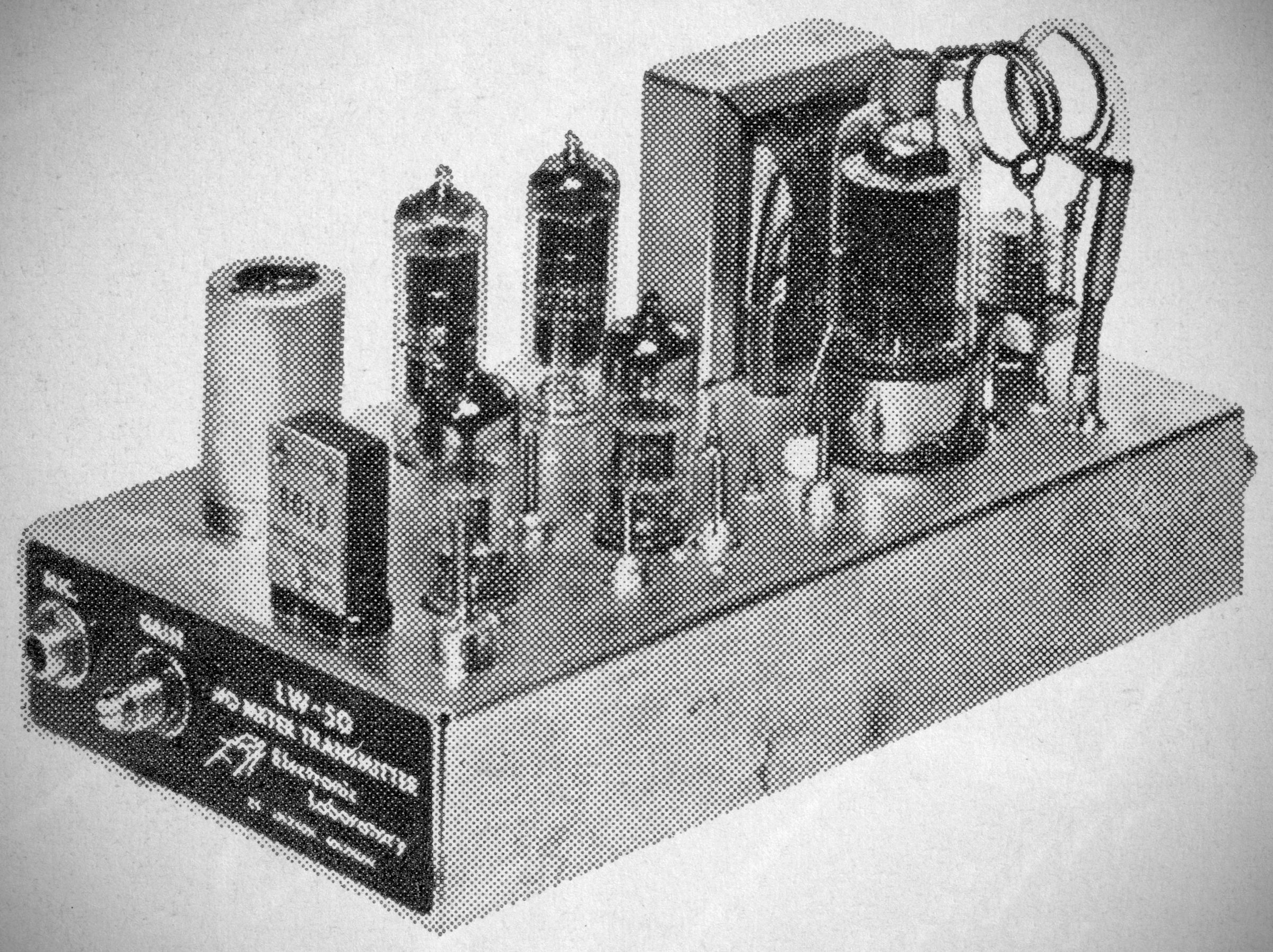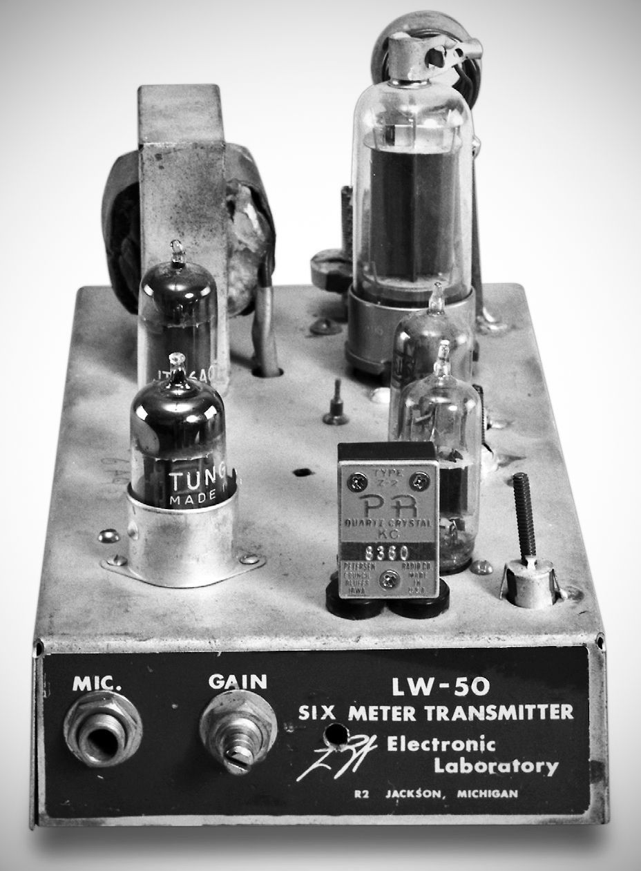 LW Electronic Laboratory of Jackson, Michigan made a line of 6 and 2 meter gear in the 1950s and early ’60s. The LW-50 transmitter ran 15 watts input. It had push-pull modulators and speech clipping. It was made for both 6 (shown) and 2 meters.