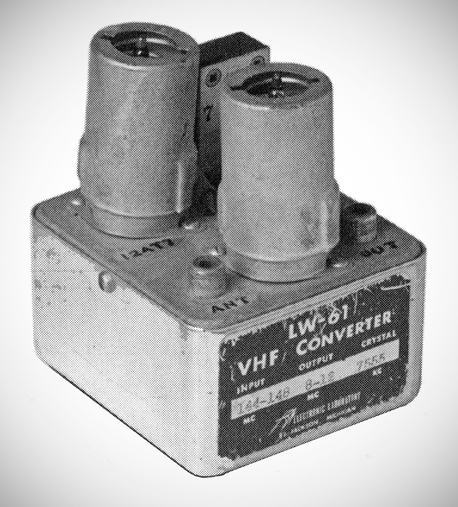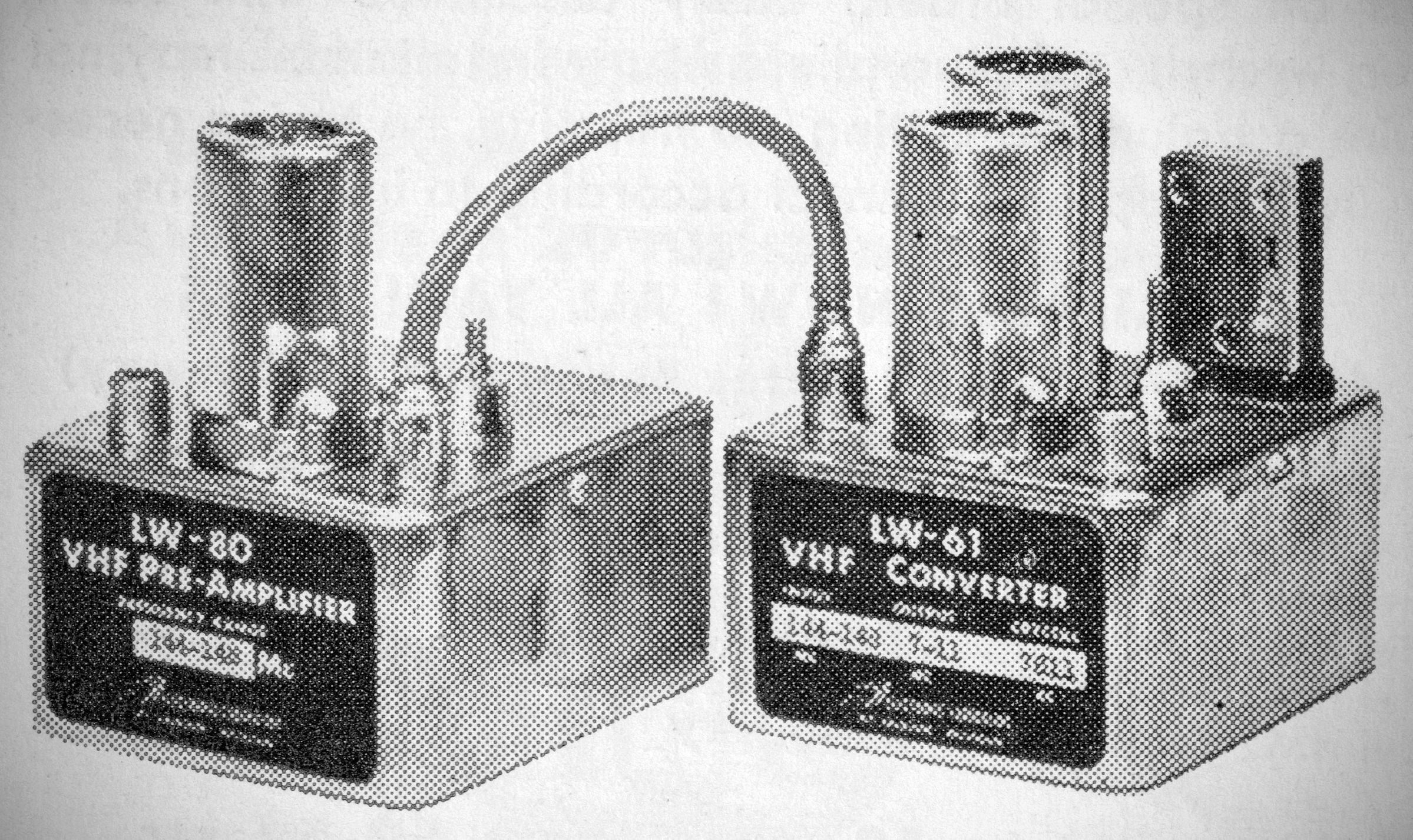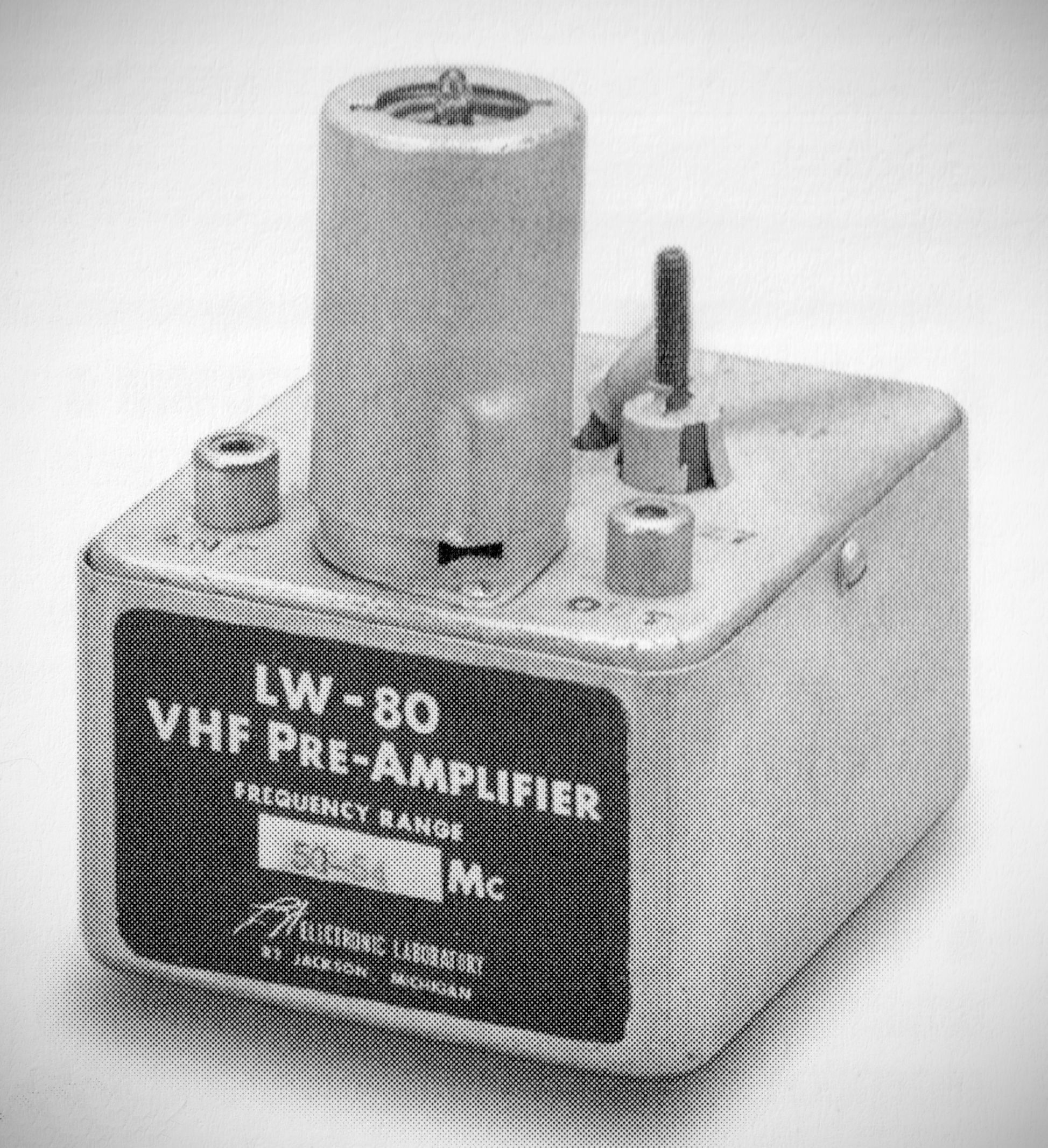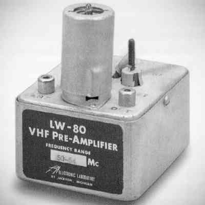 Electronic Laboratory of Jackson, Michigan made a line of 6 and 2 meter gear in the 1950s and early '60s .The LW-61 two meter converter was available with a variety of 4 MHz wide IF output ranges in the HF spectrum. A broadcast-band output could be used for mobile installations. The LW-61 was also made for 6 meters ($18.50, 1954). The LW-80 cascade VHF pre-amplifier had 20 dB gain and a 5 dB noise figure. The pre-amp in the photo is for 6 meters. The LW-80 was also made for 2 meters ($12.50).