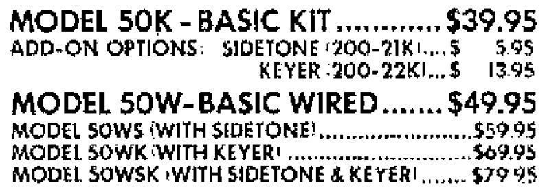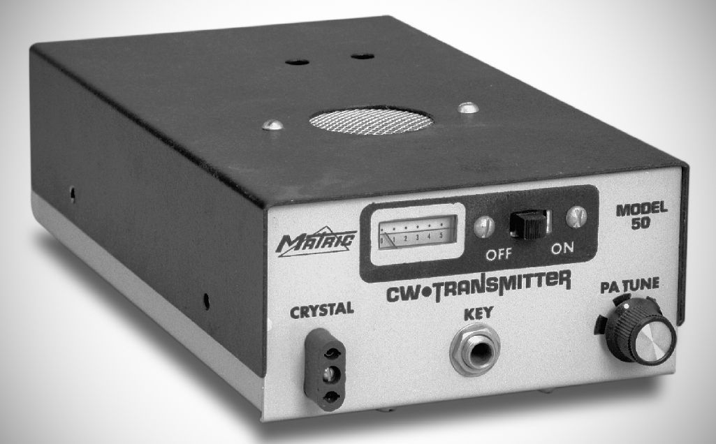 Matric’s Model 50 CW transmitter ran 15 watts and covered 160, 80, and 40 meters with plug-in coils. The transmitter had a built-in 115 VAC power supply and used a “T” output network.