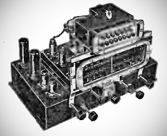 Factory aligned and wired tuning unit. Nine inch linear scales with vernier tuning. Three-gang tuning capacitor. Air tuned coils. Iron core IF transformer with electrically variable band spread. Diode second detector. Separate bass and treble controls. Inverse feedback. 15 watts audio output.