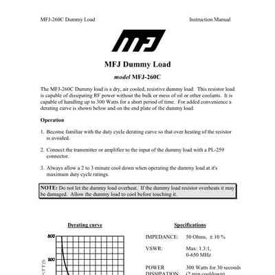 QST, Oct 1980, p. 136. QST, Feb 1981, p. 114. QST, Jul 1982, p. 141. The MFJ model 260 dummy load used a 50 ohm, non-inductive resistor in its vented metal housing. It was rated at 300 watts for 30 seconds. The 260C is visually identical.