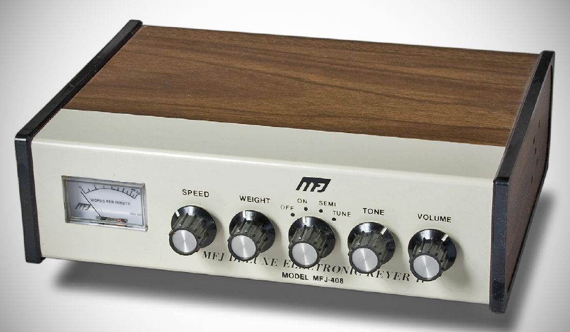 The 408 Deluxe Electronic Keyer II used an 8044 chip with a speed readout function. A meter on the front panel indicated code speeds to 50 wpm. The 408 was compatible with either single- or double-lever paddles and also had a semi-automatic “bug” mode.