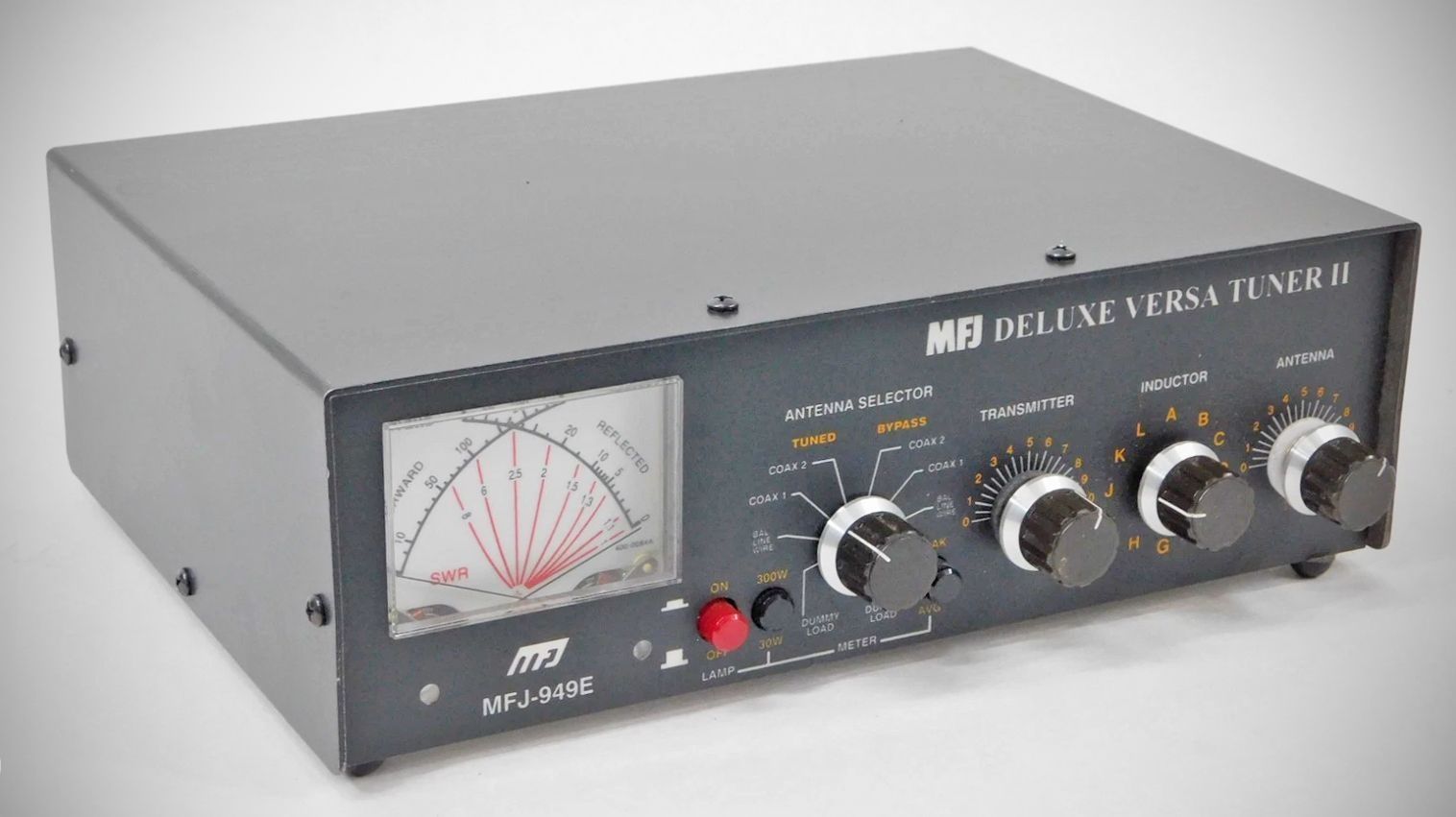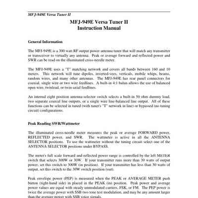 The MFJ-949E is a 300 watt RF output power antenna tuner that will match any transmitter or transceiver to virtually any antenna. Peak or average forward and reflected power and SWR can be read on the illuminated cross-needle meter.