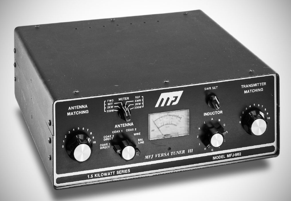 The Model 962 Versatuner III handled 1.5 KW and tuned continuously between 1.8–30 MHz. It matched coax, balanced feedlines, and random wires. A 6-position switch selected a pair of coax lines direct or through the tuner, as well as a balanced line and a random wire. Its meter read SWR, and forward and reflected power on 200 and 2000 watt scales.
