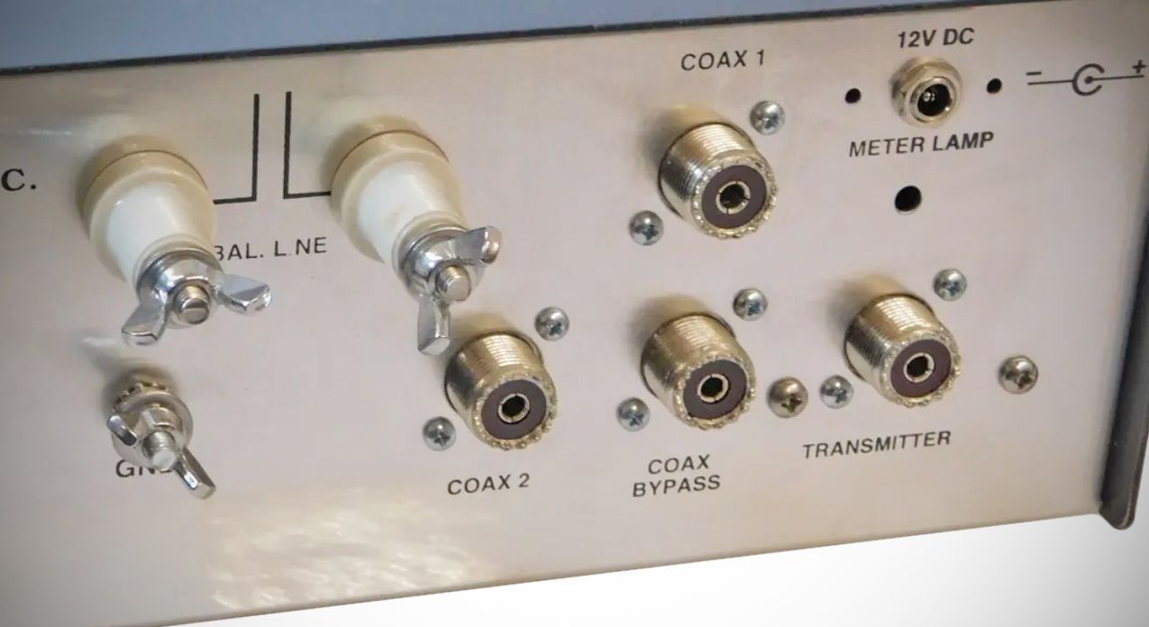 An internal six position antenna-selector switch selects two separate coaxial line outputs either in tuned (with tuner's matching network in line) or direct (no matching circuit) configurations, a balanced line output, and a coax bypass position for accessories such as an external dummy load. Long wire antennas can be connected to the center connector of the coax connector.