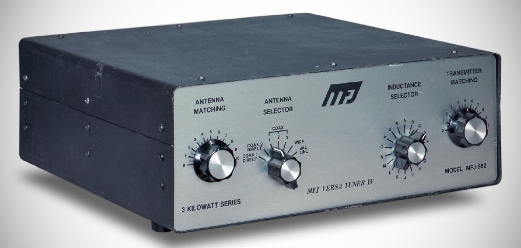 The MFJ 982 Versatuner IV was rated up to 3 KW PEP and matched any feedline—coax, random wire, or balanced line—from 1.8 to 30 MHz. It had a seven-position antenna switch, dual inductors, and a 4:1 encapsulated balun.