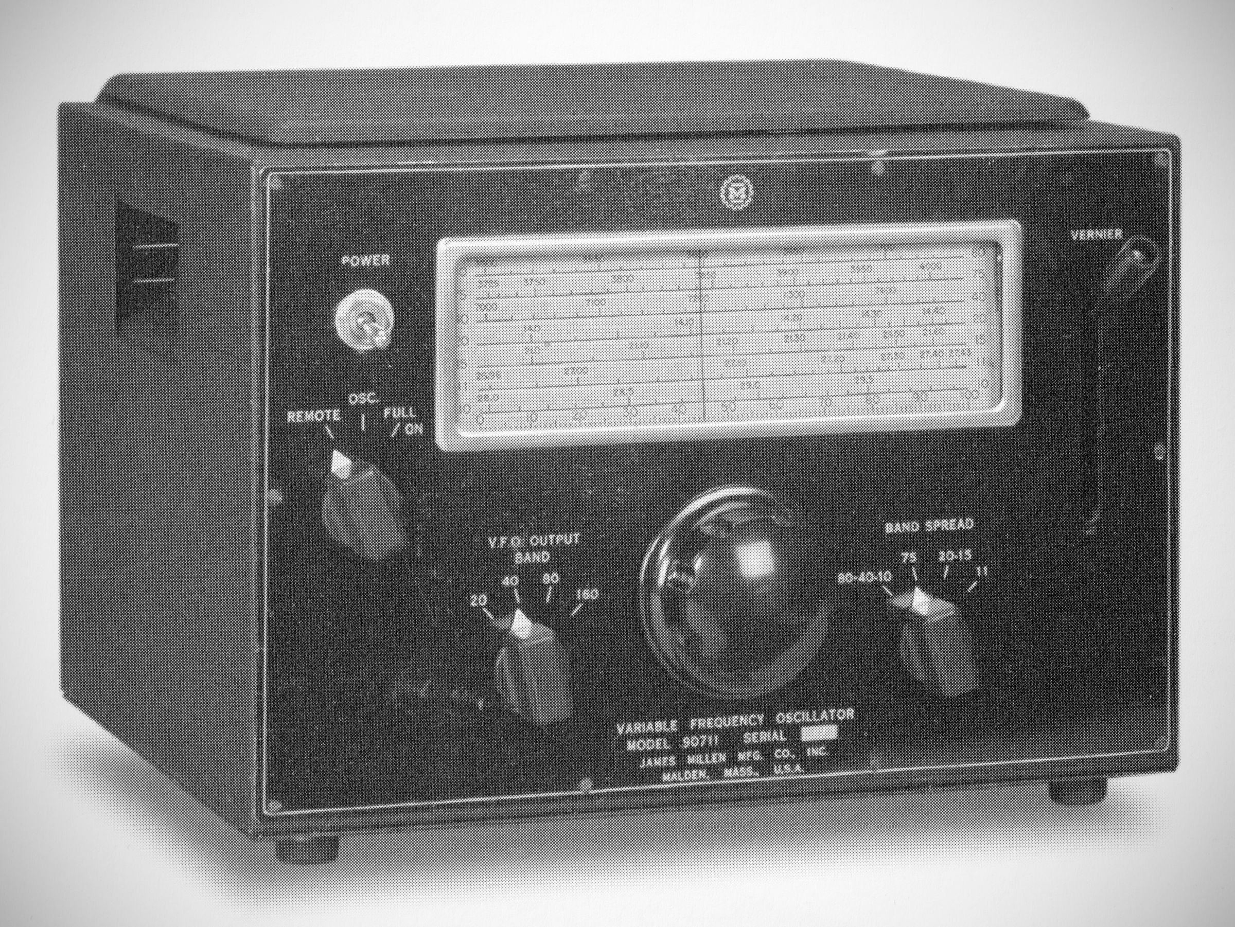 Millen's 90711 VFO had sufficient output to drive an 807 on 160, 80, and 40 meters, with reduced output on 20. Its slide-rule dial was calibrated for 80-10 meters. The lever to the right of the dial was for vernier frequency adjustmen.