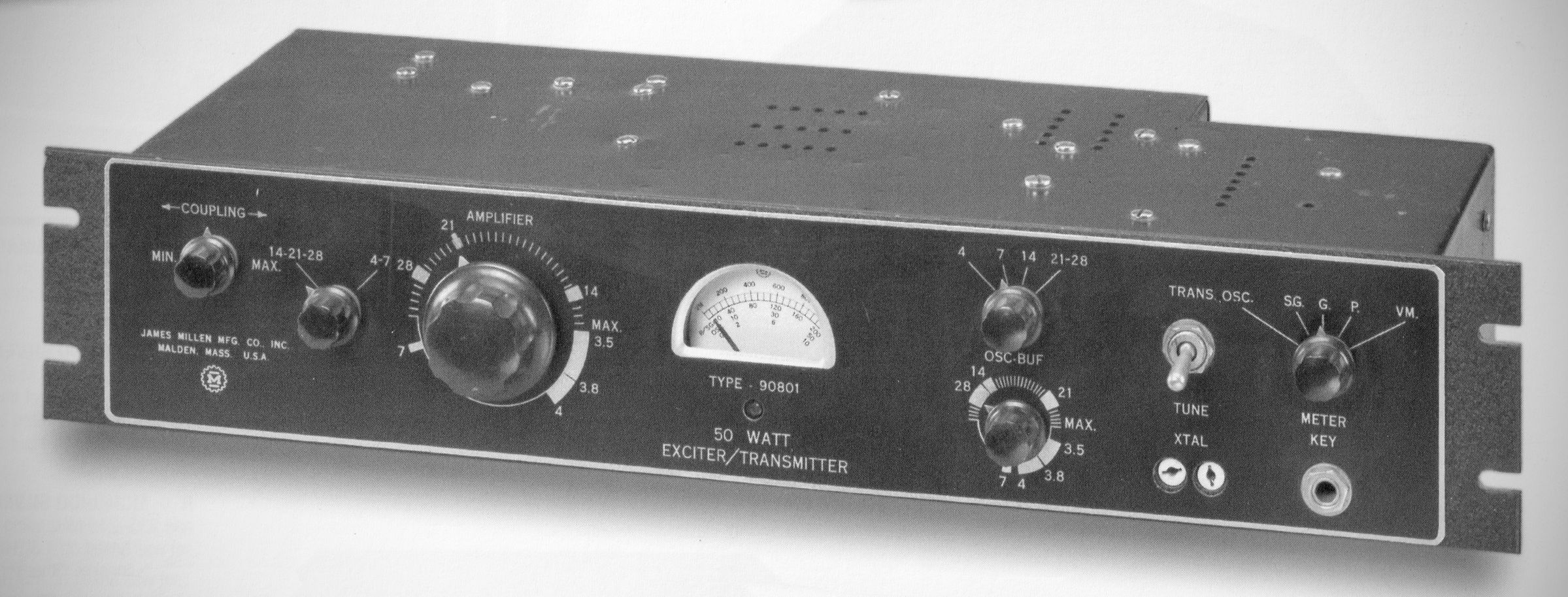 An improved version of the 90800 with band switching, so that no coil swapping is required. Based on a transmitter design in the December 1952 issue of QST, page 23. The original Millen schematic indicates a design date of July 1953. It did not appear in QST until March 1954.