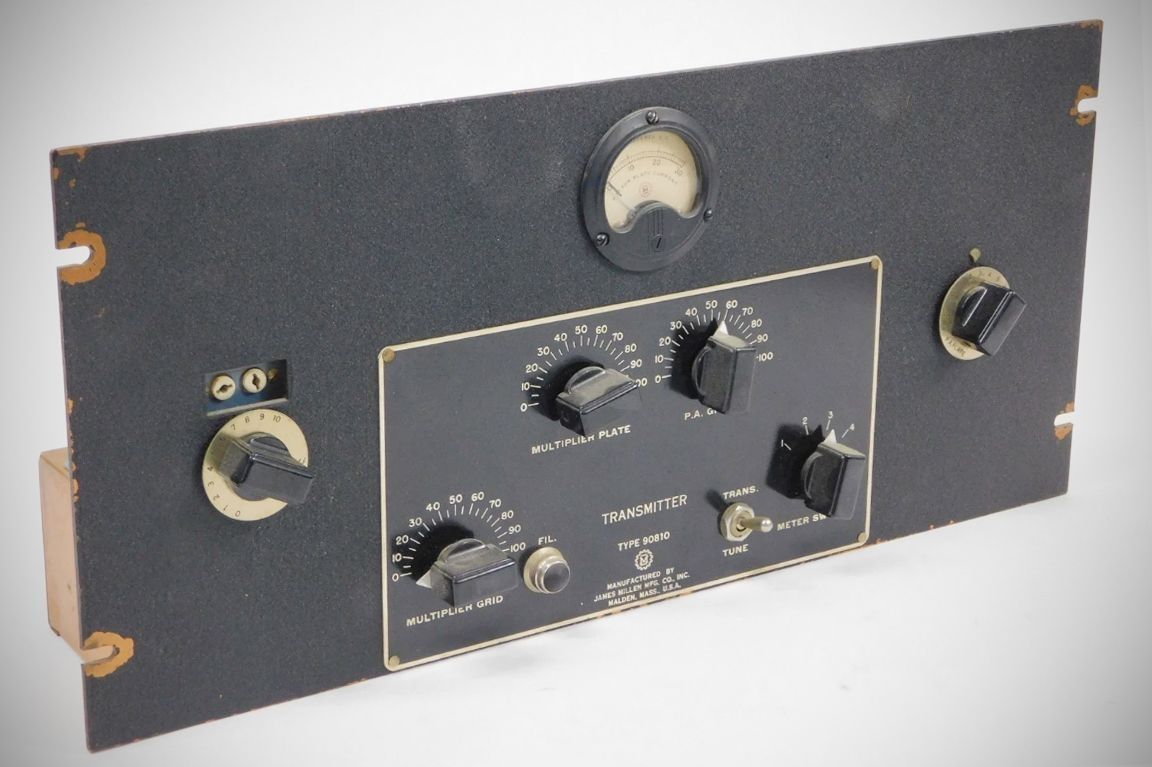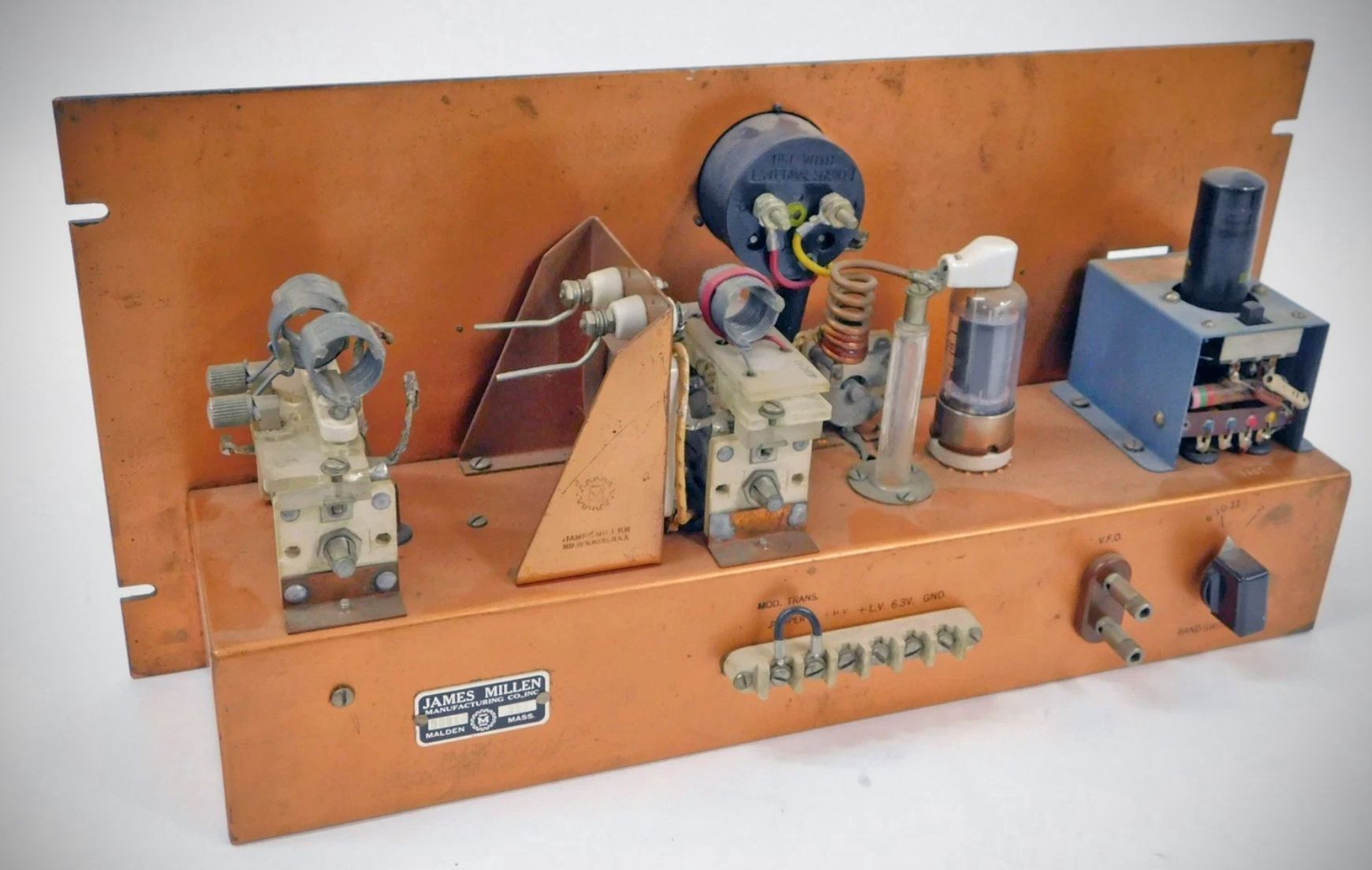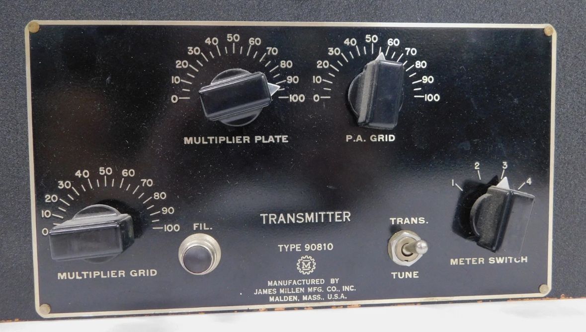The 90810 transmitter worked on 20 and 10 meters but could also be used on 6 and 2. Power output from its 829B final was 75 watts. Behind the panel, the transmitter's component parts were a Bliley CC0-2A crystal oscillator and Millen's 90811 amplifier. It used plug-in coils.