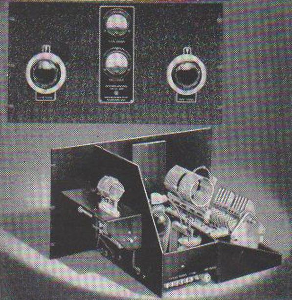 Individual meters for grid (100 mA) and plate current (500 mA). Plate tuning capacitor (Millen type 16060) has constant low impedance and multi-finger high current rotor contactor, and is rated at 6000 volts. Disc-type neutralizing capacitors (Millen type 15011) have a stop to prevent shorting, and a rotor lock.