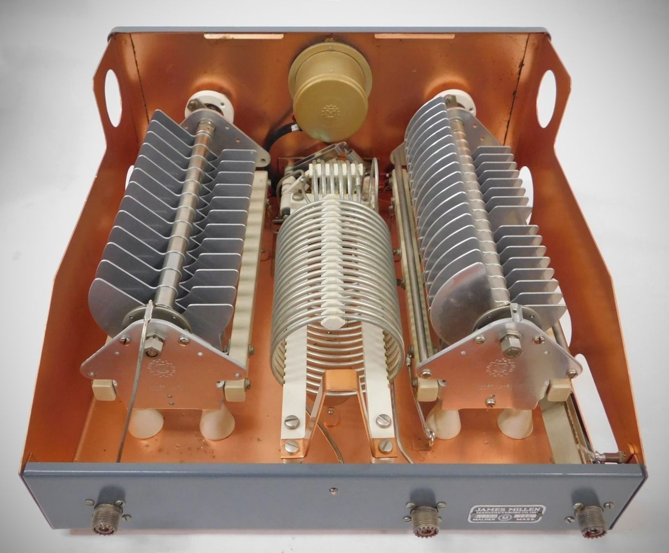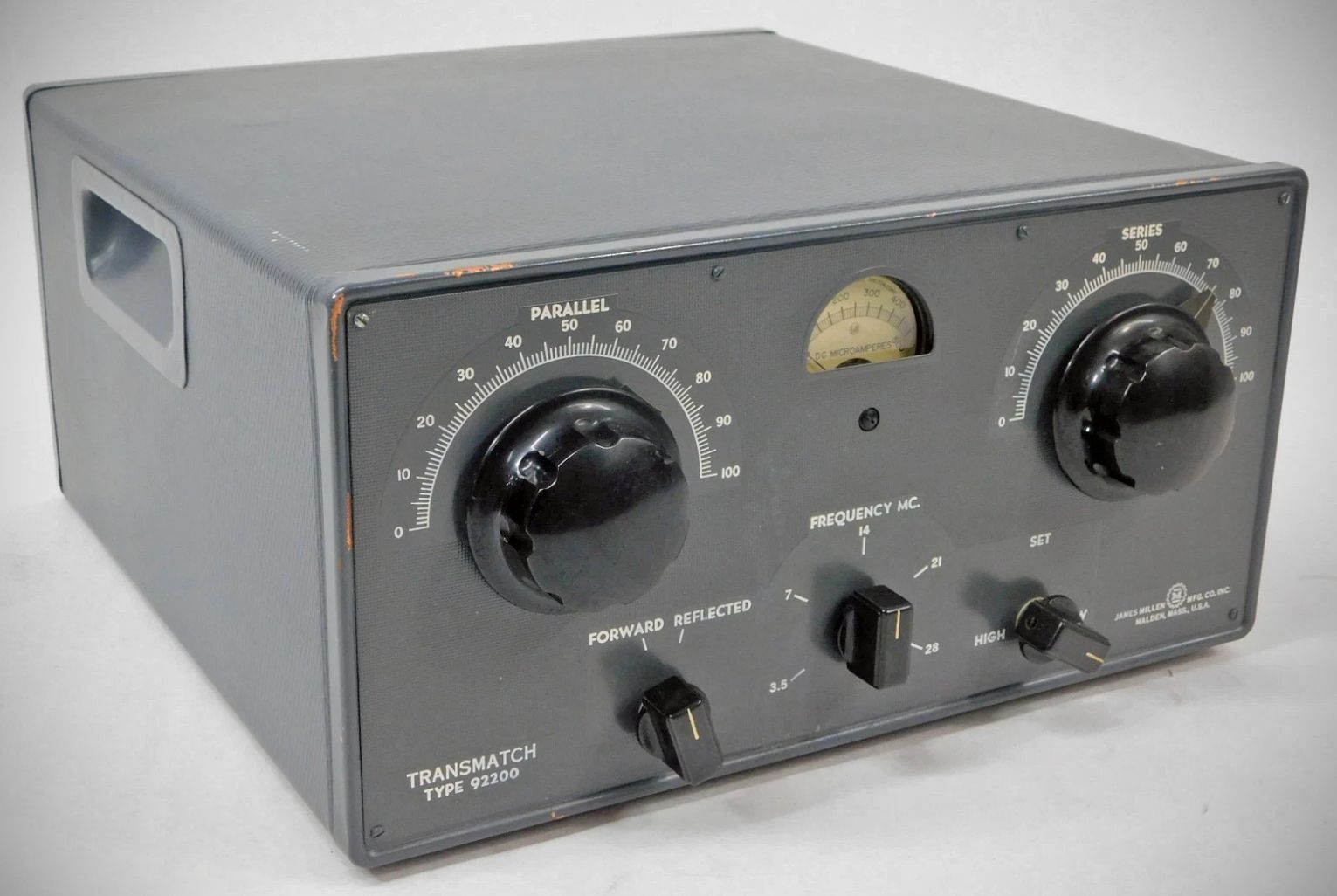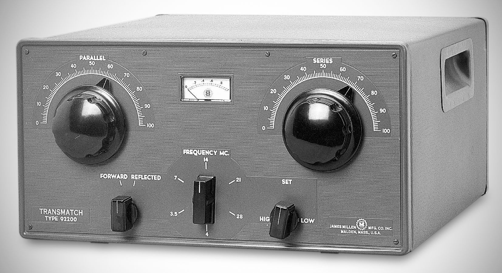 The Millen 92200 Transmatch was an unbalanced tuner that handled a kilowatt and matched loads from 10 ohms to greater than 1000 ohms, depending on the frequency. It used band switching to cover 3.5–29.7 MHz, and early versions had separate ranges for 80 and 75 meters. The 92200 had a built-in forward and reflected power meter and a link-coupled output for a modulation monitor.