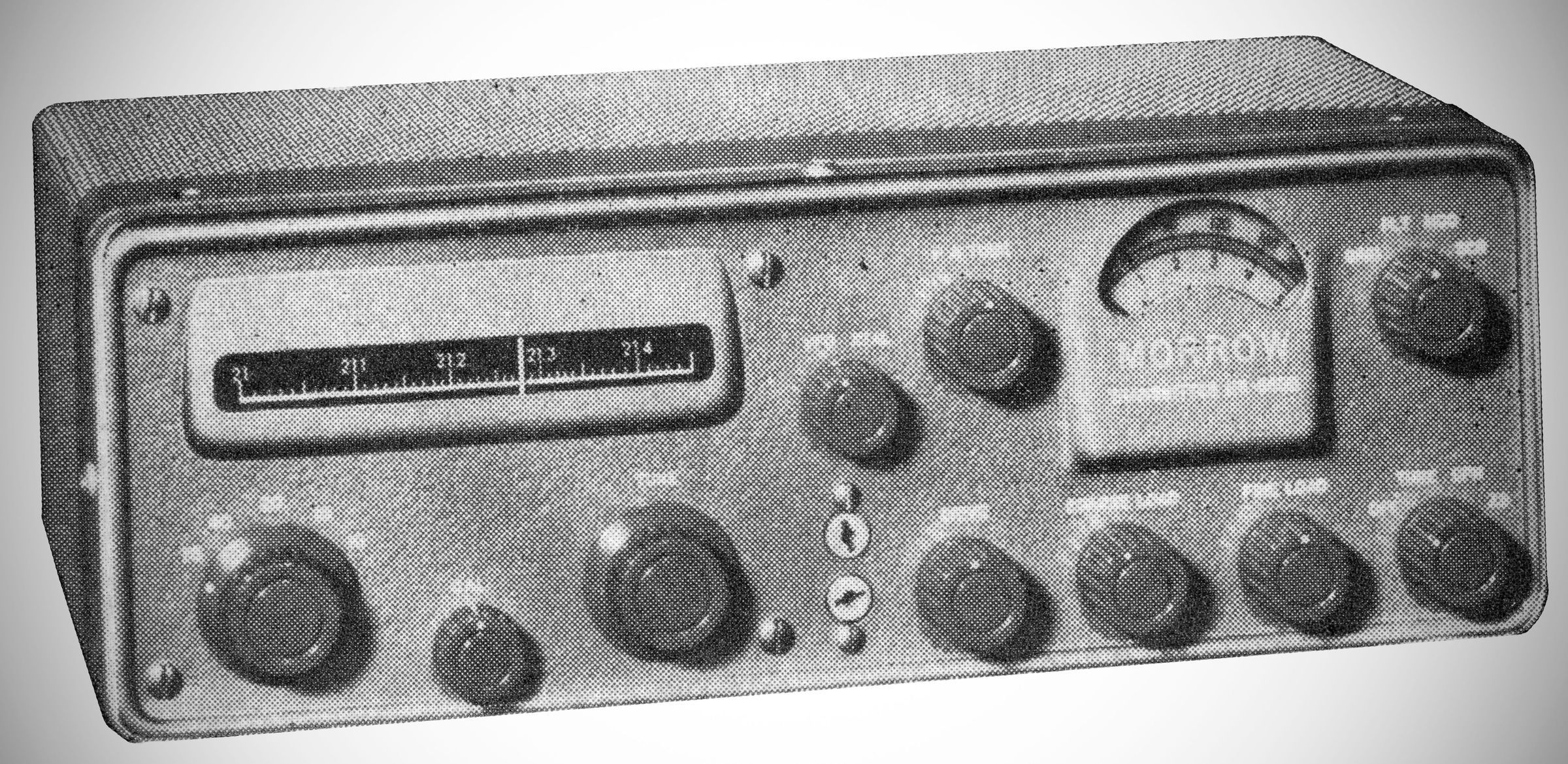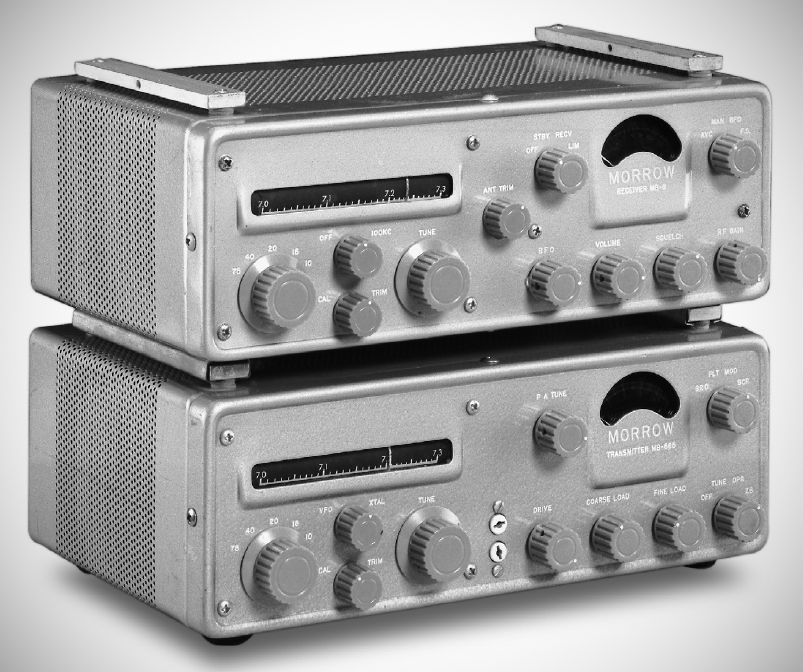 Morrow’s mobile pair were matched in size and appearance. Each covered the 80–10 meter bands. The MB-6 receiver was a 13-tube, double-conversion set with built-in noise limiter and squelch circuits. Power input to the MB-565 transmitter’s 6146 final was 60 watts. High-level plate modulation was used on AM phone. All stages except the final were gang-tuned and tracked with the exciter. An antenna changeover relay was incorporated into the transmitter.