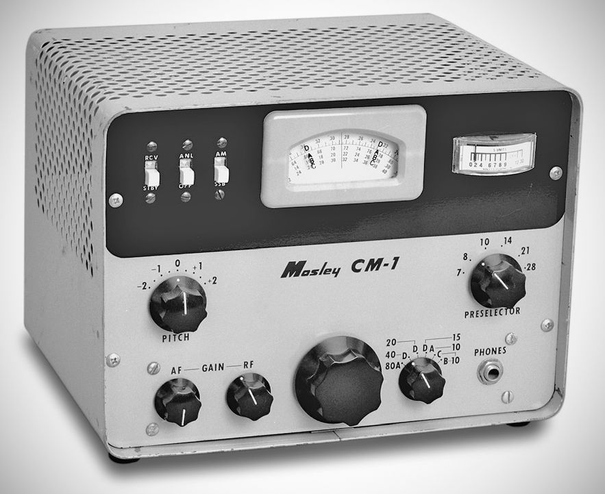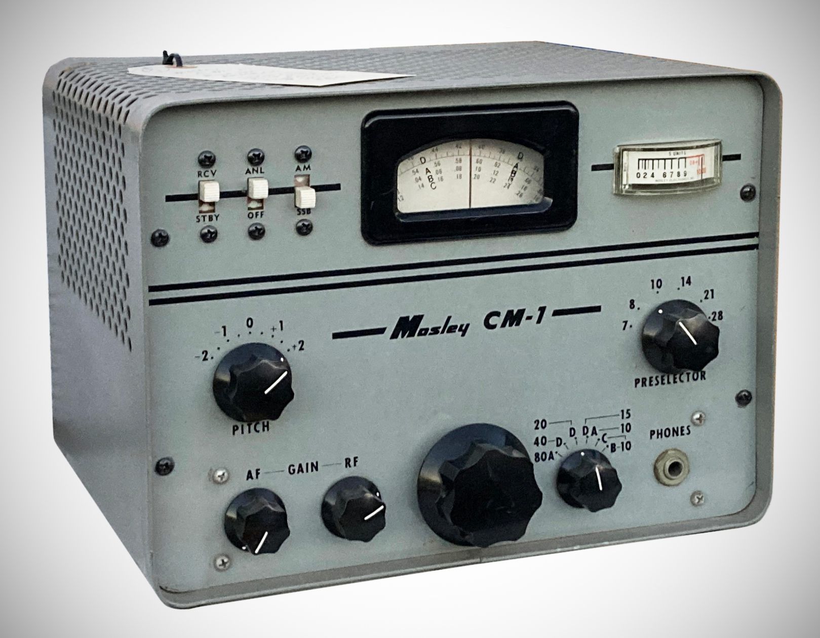 It was easy to stock replacement tubes for the CM-1. In the compact Mosley ham receiver, every tube in the set was a 6AW8; the receiver used five of them plus two 1N34 diodes. The double-conversion CM-1 covered the 80 through 10 meter bands and WWV at 15 MHz. The two receivers pictured illustrate the cosmetic differences between early- and late-production units.