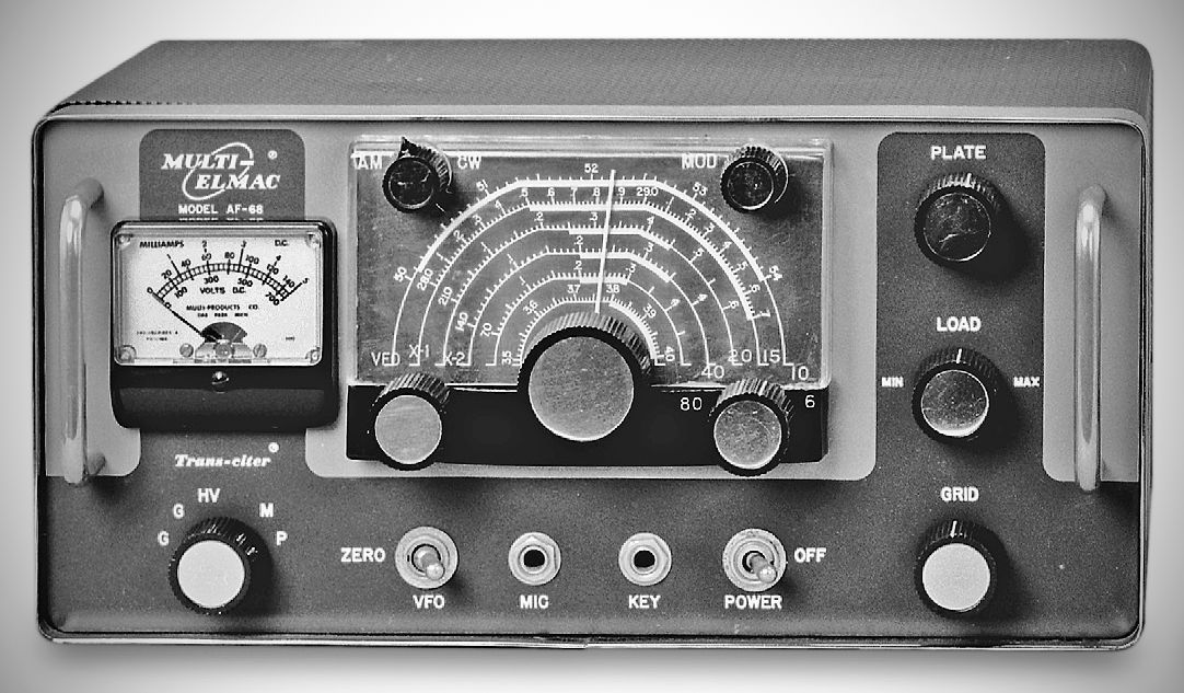 Multi-Elmac’s AF-68 trans-citer was designed to do service in both home and mobile stations. The AM and CW rig ran 60 watts input on 80–6 meters. The 40 watts of audio from its push-pull 6L6s could be used to drive the modulator of a high-power transmitter. It had a pi-net output.