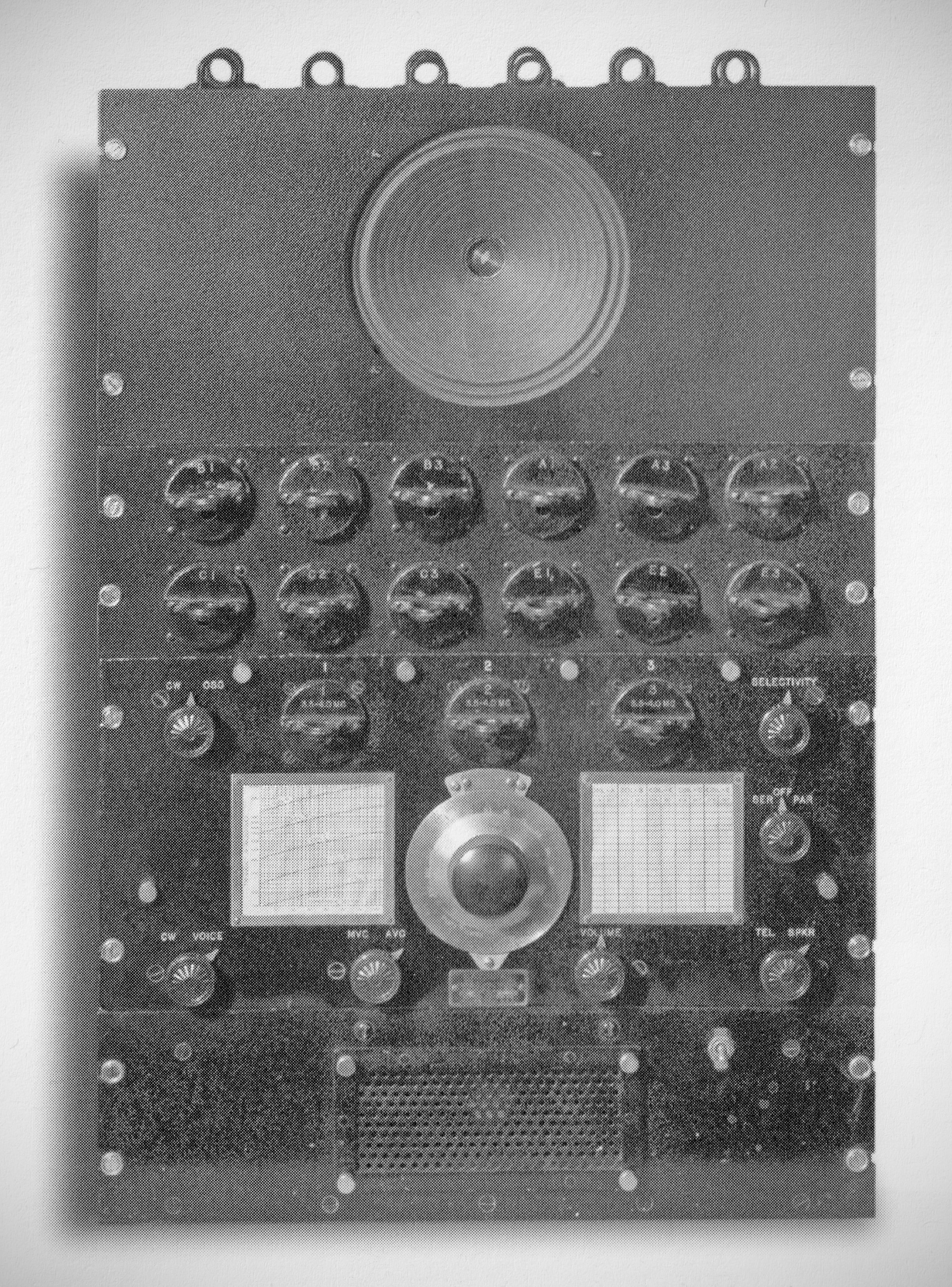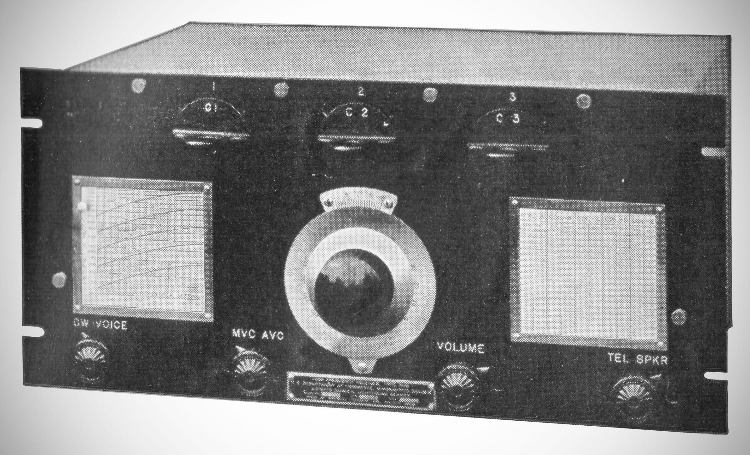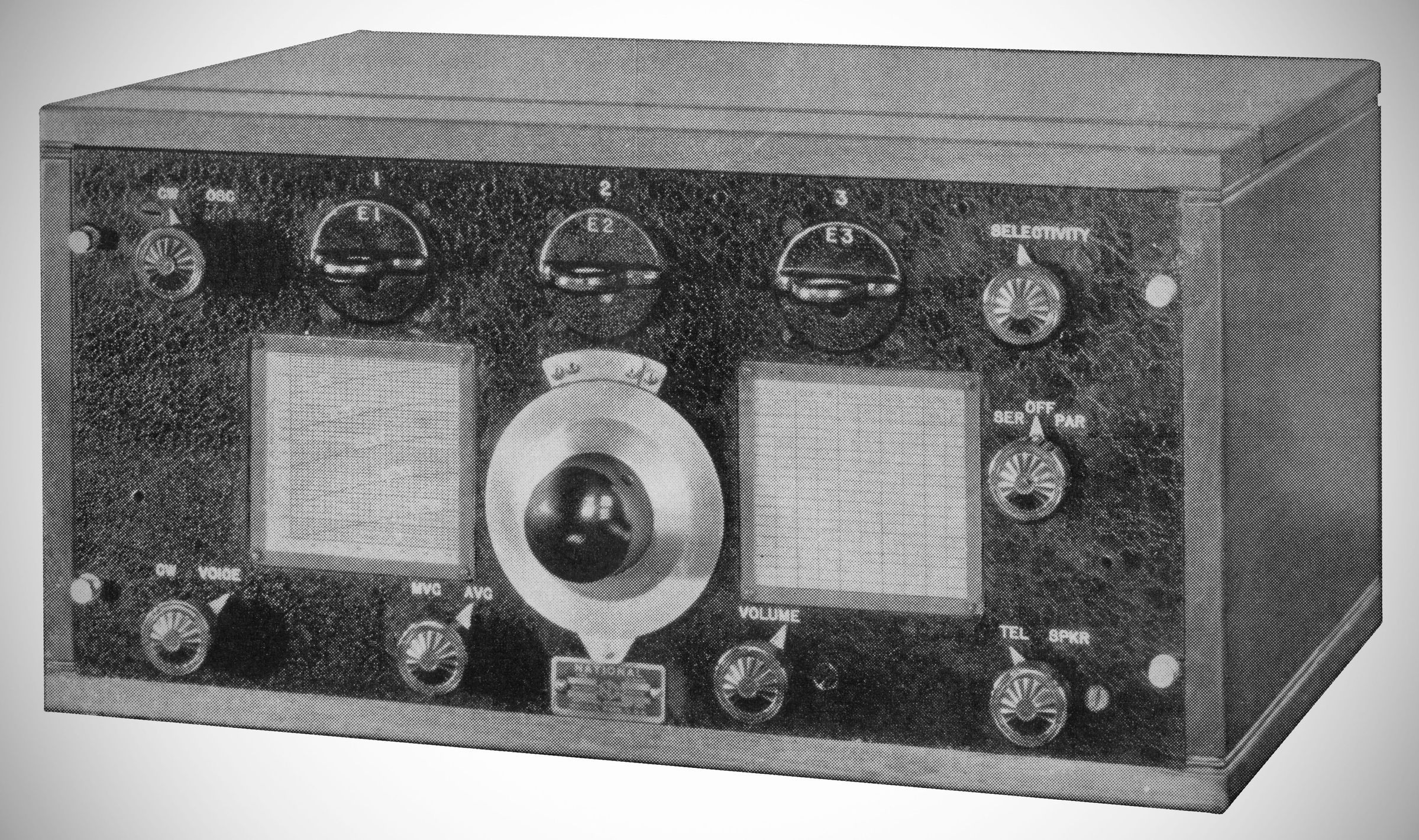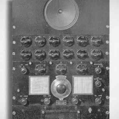 National developed the AGS series of receivers for the Airways Division of the U.S. Department of Commerce for use in their Air-Ground stations. It was marketed to the Amateur Radio Service as well. The "X" version denotes a crystal filter. The nine-tube set used three coils per band to cover 1.5-20 MHz. They plugged in through the front panel. The rack-mount version shown here has a power supply, speaker, and storage space for the coils not in use; $295.00, 1933. (2)